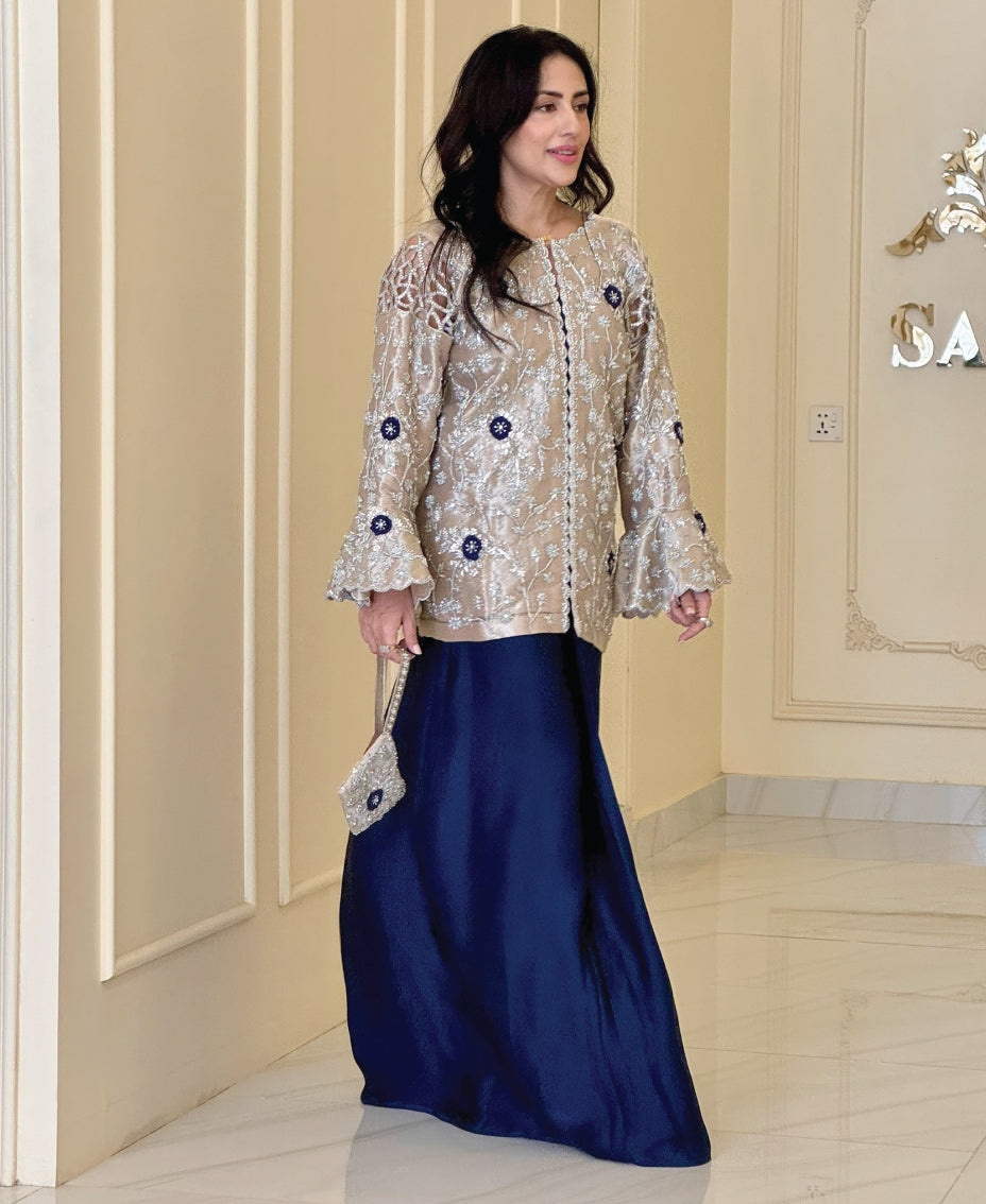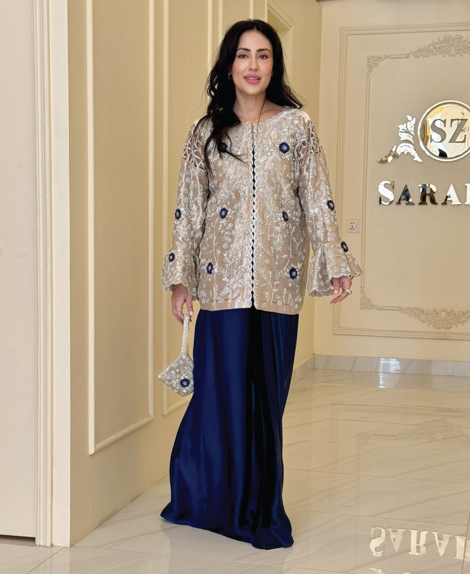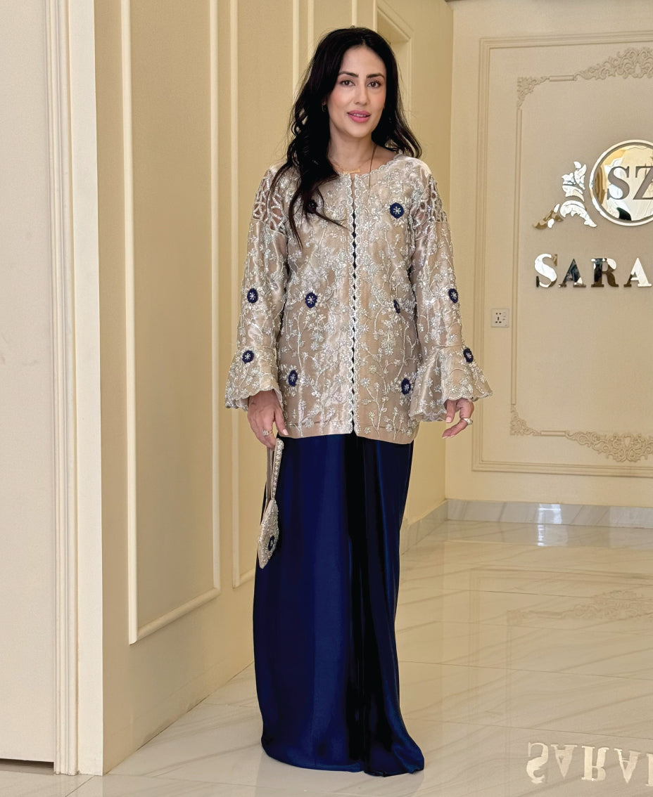 The elegant formal wear features a champagne Pure LAMA tissue cardigan with full hand embroidery, paired with a draped skirt made of pure law silk (80 grams). The cardigan has ruffled sleeves with blue 3D floral embroidery details along with the cut work. The skirt is in a deep blue hue, contributing to the overall elegance of the attire.