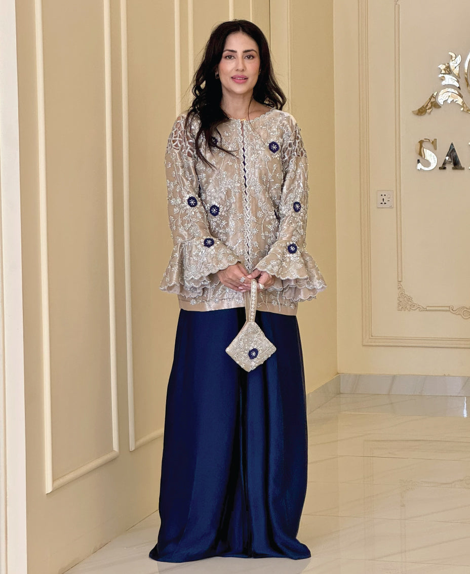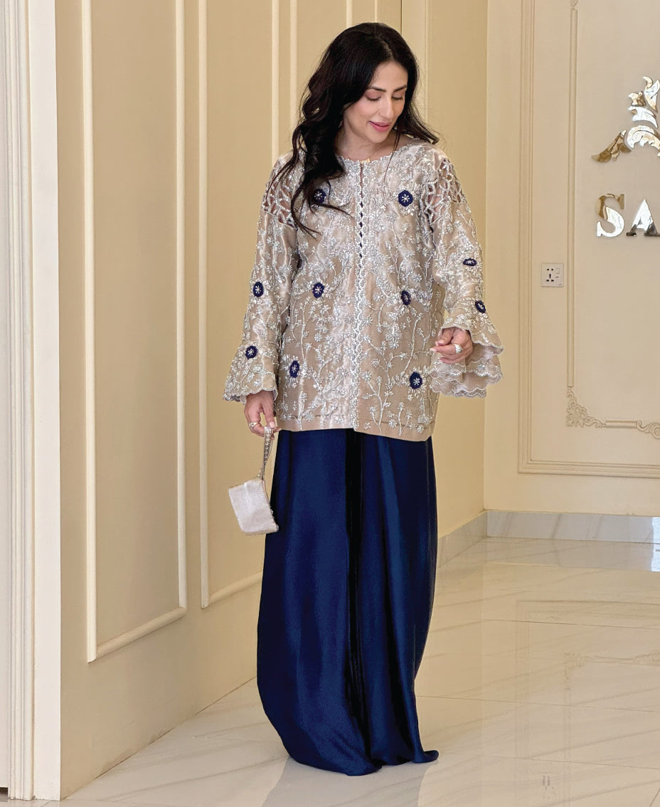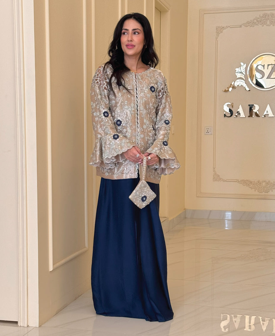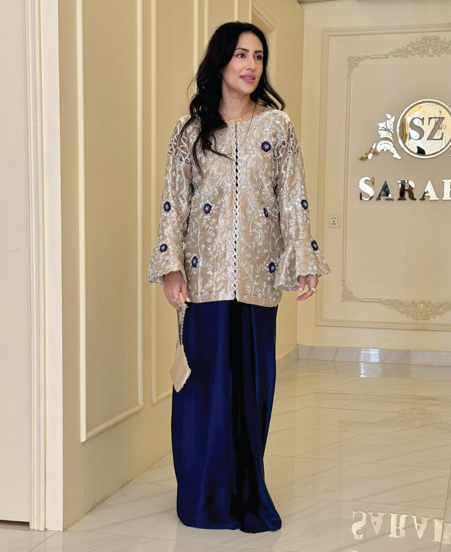 The elegant formal wear features a champagne Pure LAMA tissue cardigan with full hand embroidery, paired with a draped skirt made of pure law silk (80 grams). The cardigan has ruffled sleeves with blue 3D floral embroidery details along with the cut work. The skirt is in a deep blue hue, contributing to the overall elegance of the attire.