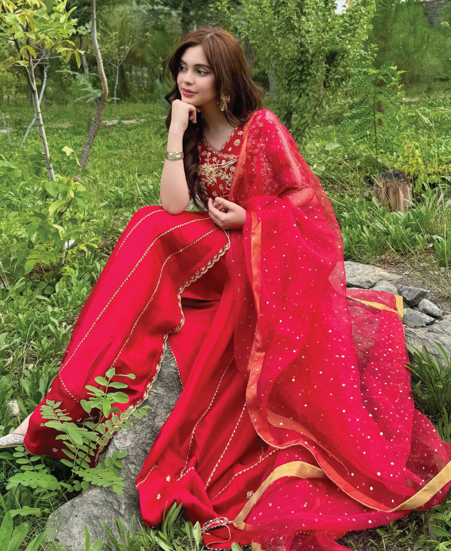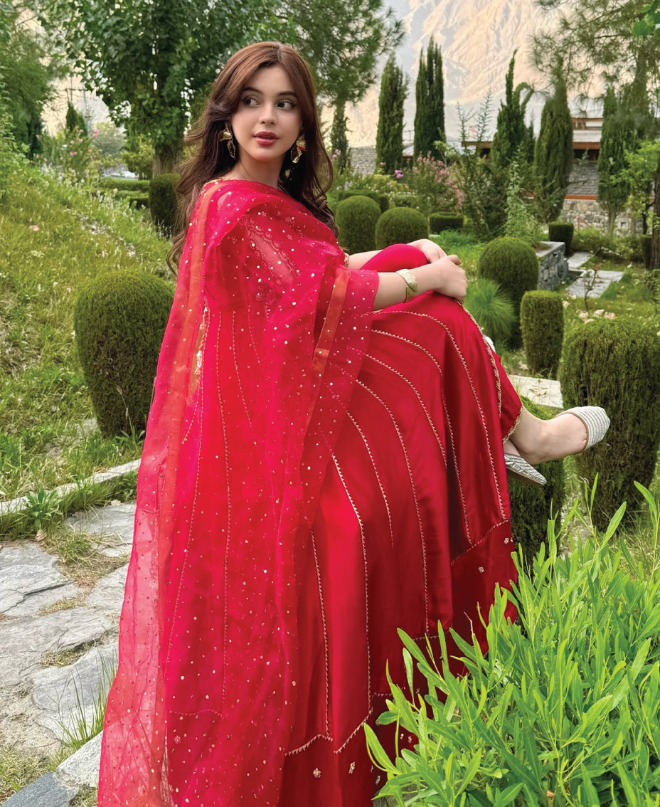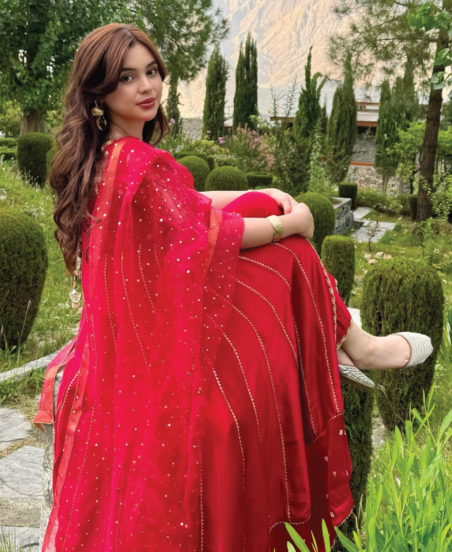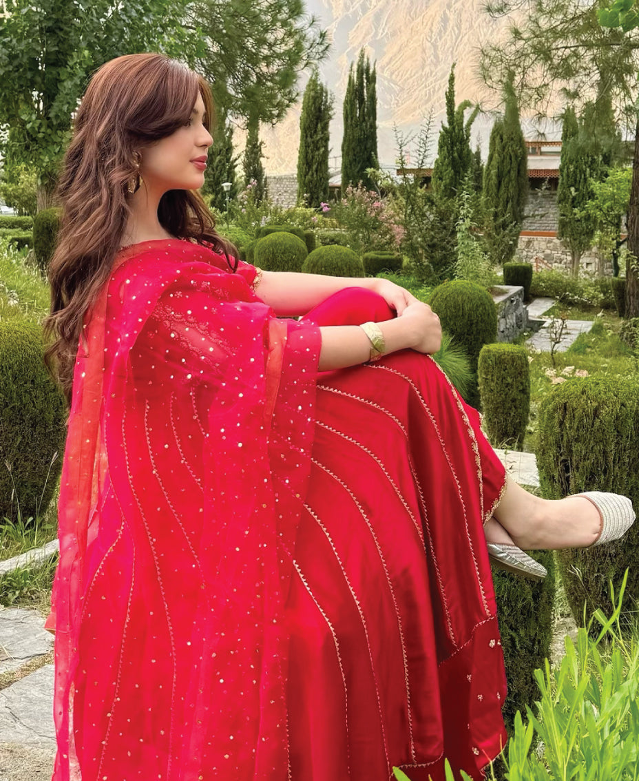 Complementing the dress is a sheer red dupatta, embellished with scattered golden chan that catch the light, adding a subtle shimmer to the overall look. A golden applique along the edges of the dupatta introduces a refined contrast, tying the outfit together with understated luxury. The combination of sheesha silk, zardozi kora, and dabka work speaks to the rich heritage of the couture, making this outfit a stunning choice for formal occasions or cultural celebrations.