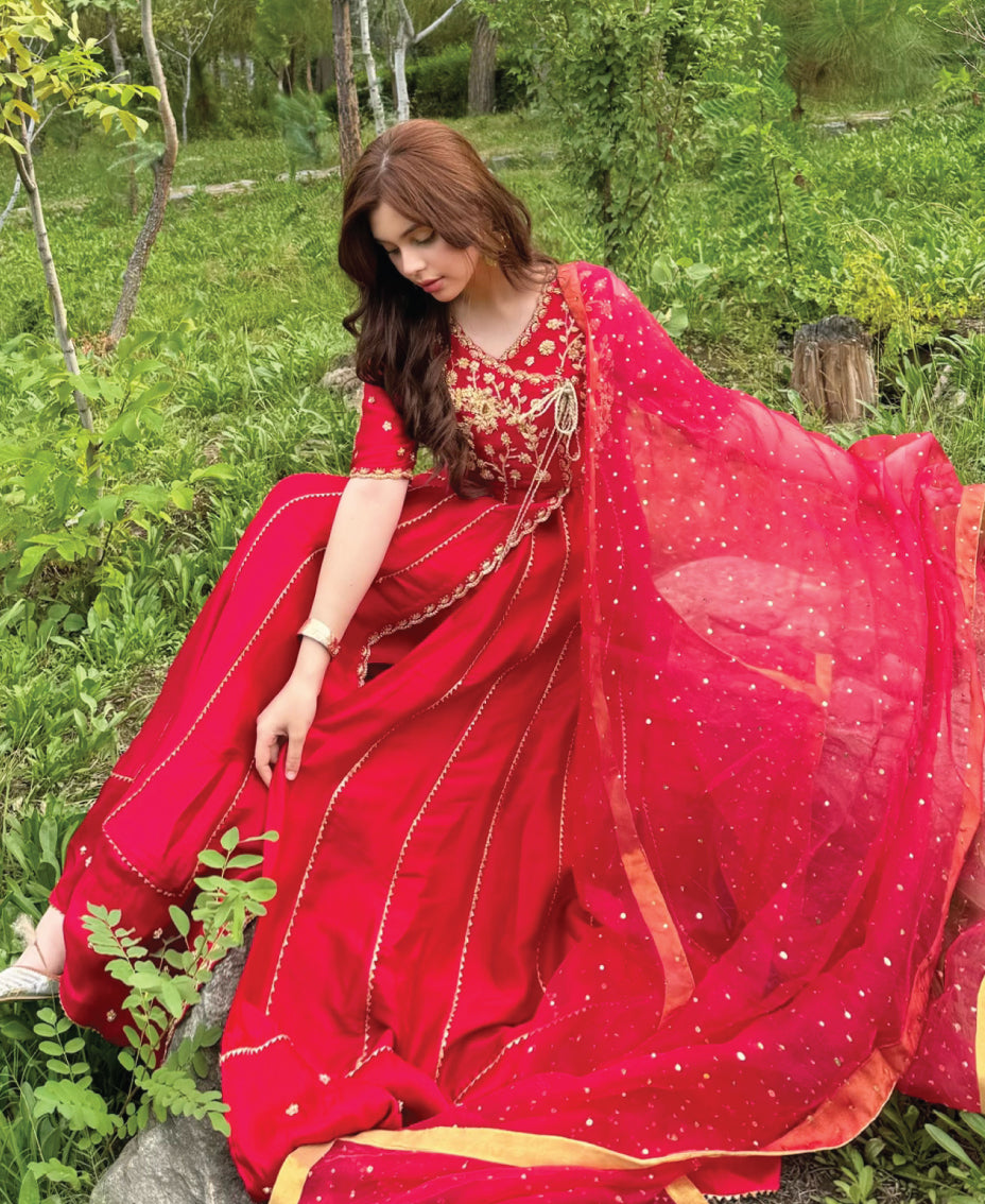 The breathtaking manifestation of traditional outfit elegance, crafted in luxurious sheesha silk adorned with intricate zardozi kora and dabka work. The vibrant red dress boasts a flowing silhouette that gracefully drapes around, showcasing delicate gold zardozi embroidery that adds a touch of opulence and sophistication.