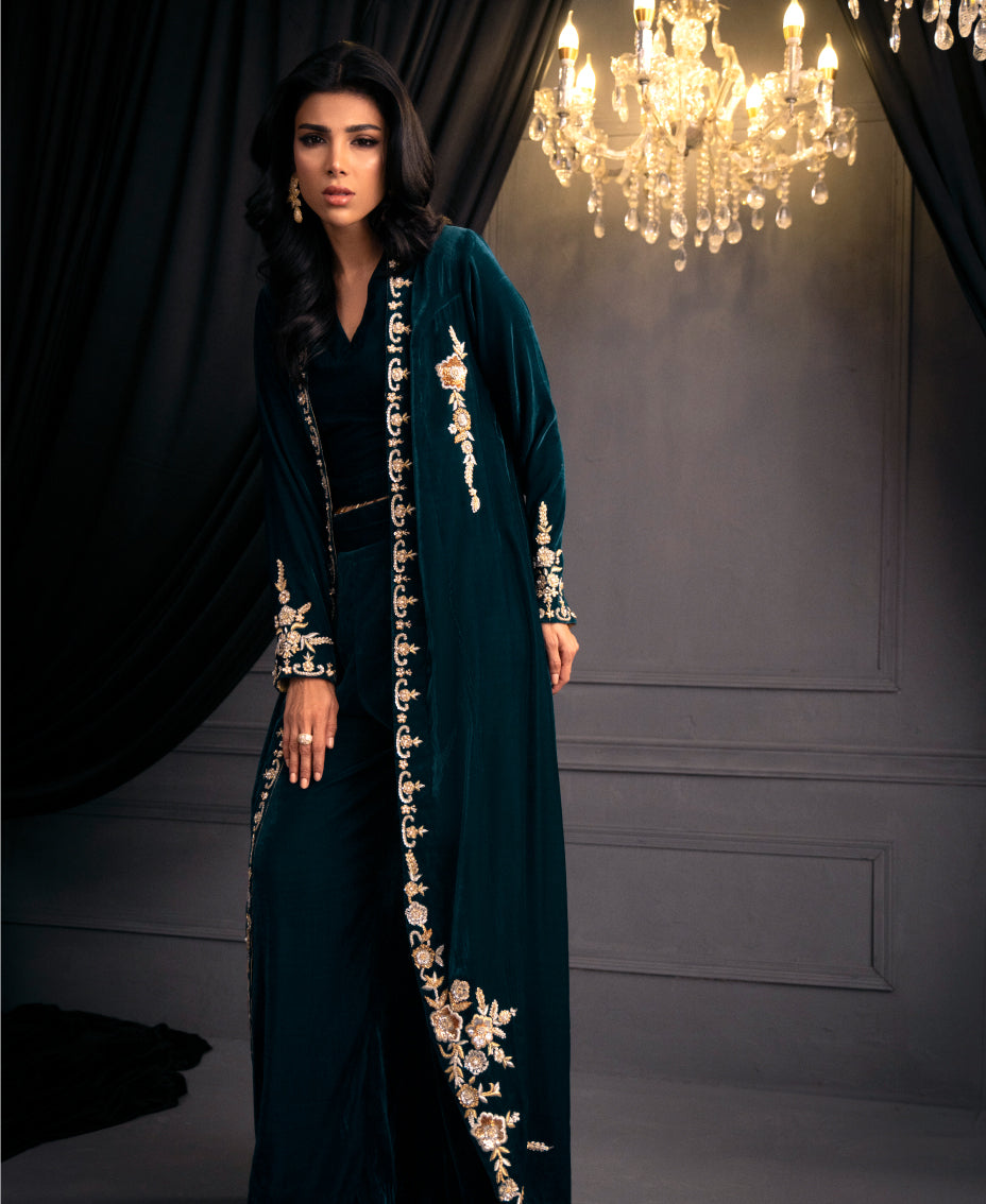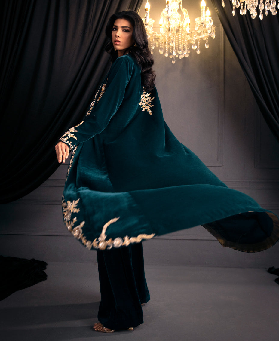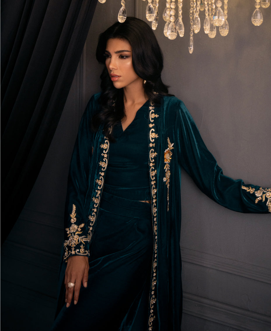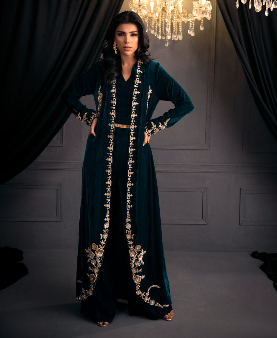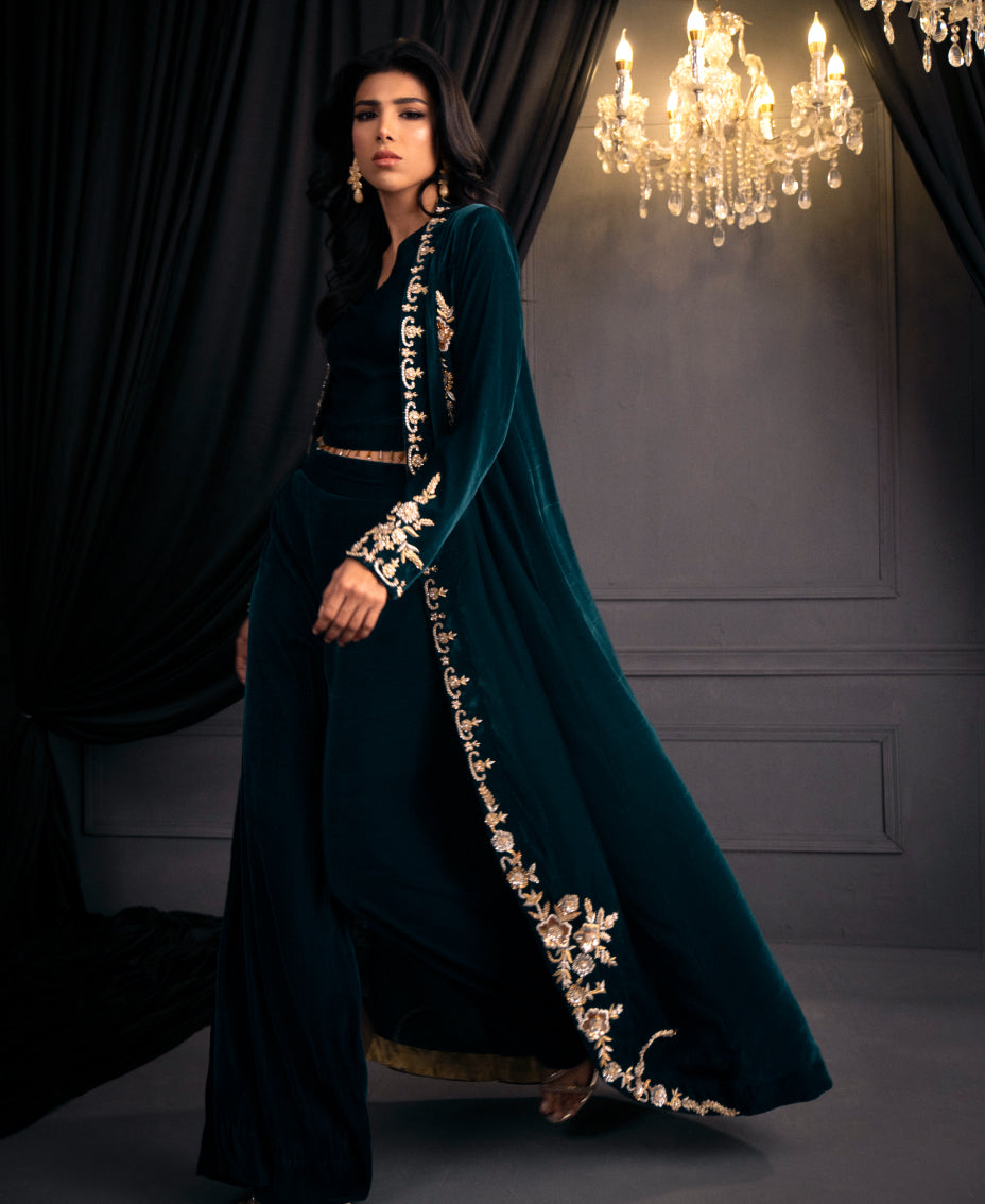 The mesmerizing teal blue velvet formal outfit ensemble of a long shrug with round edge and matching wide-leg pants. The shrug features intricate gold embroidery along its edges and sleeves, adding a touch of luxury. paired with a fitted top underneath, cinched at the waist with tassels on its hem. The outfit's  creating a cohesive and elegant look perfect for a formal or festive occasion. The overall effect is sophisticated and eye-catching, highlighting the beauty of traditional attire with a modern twist.