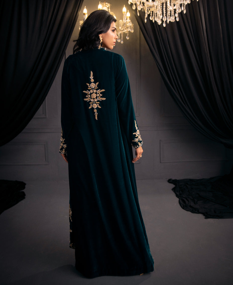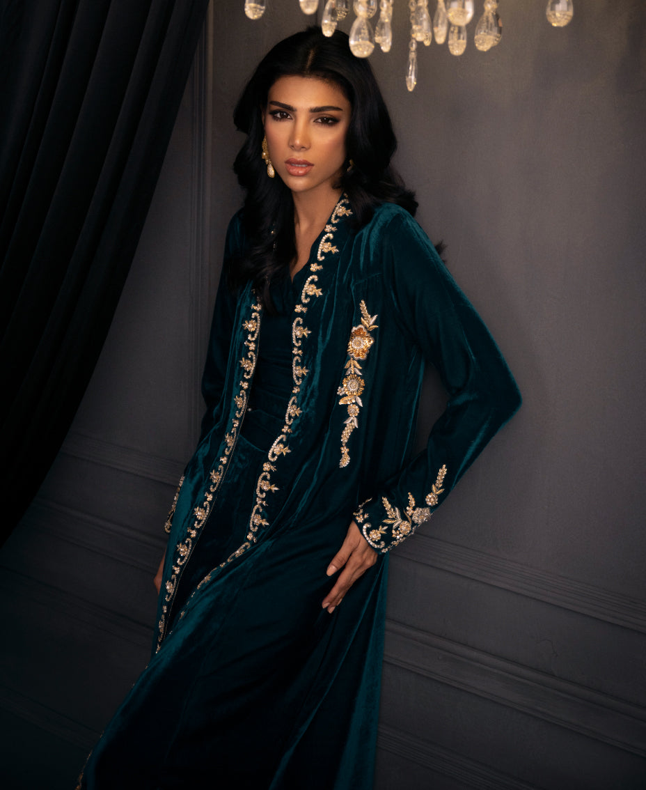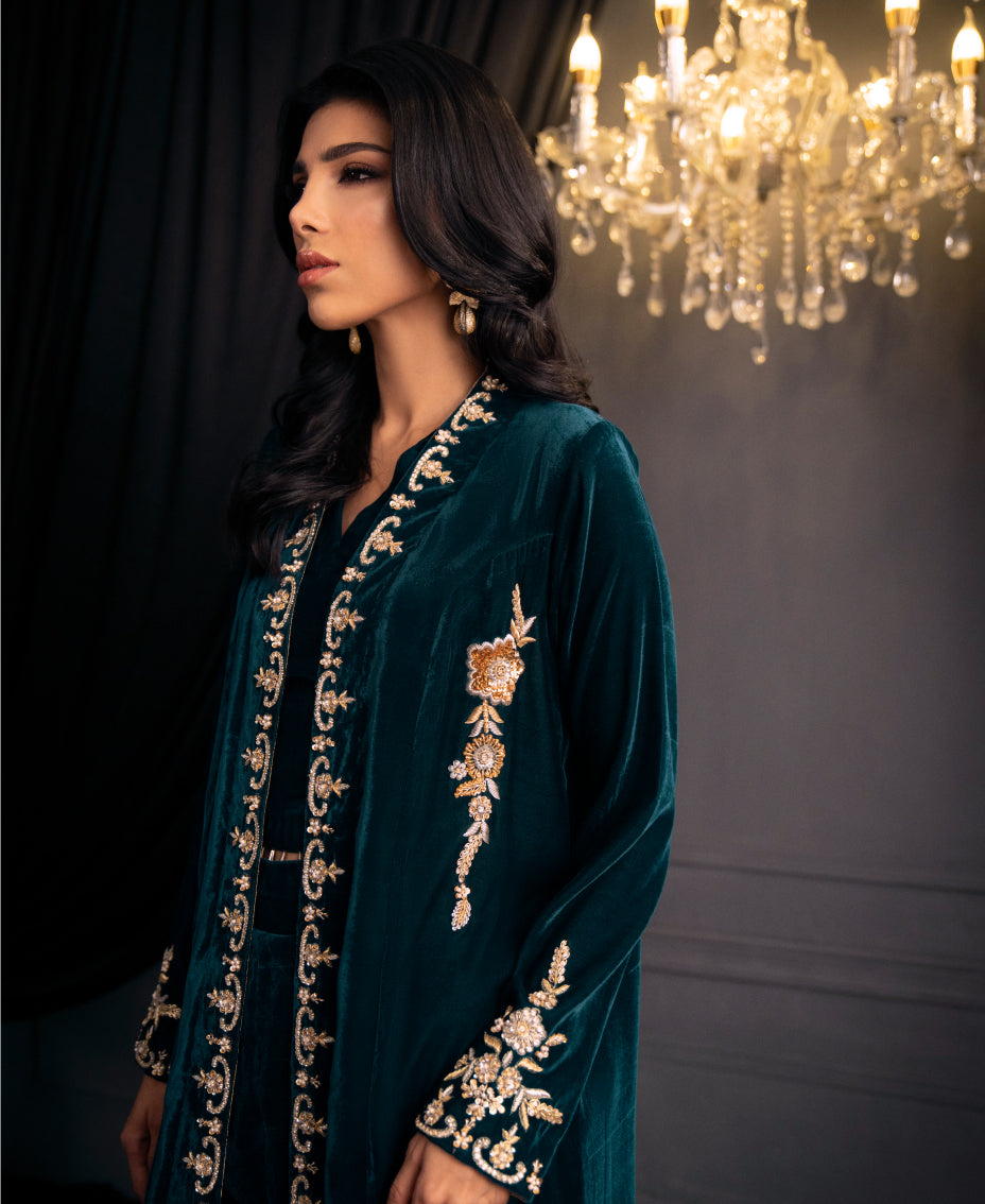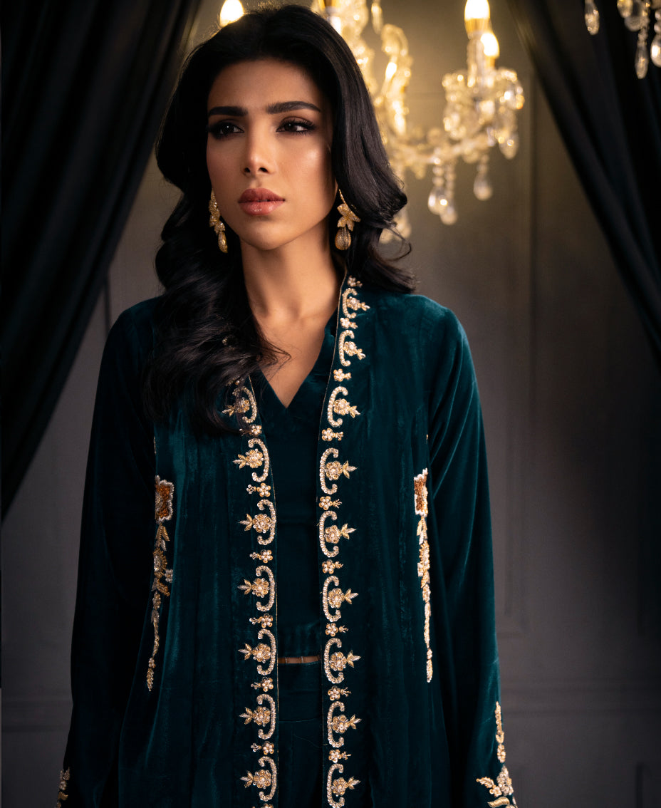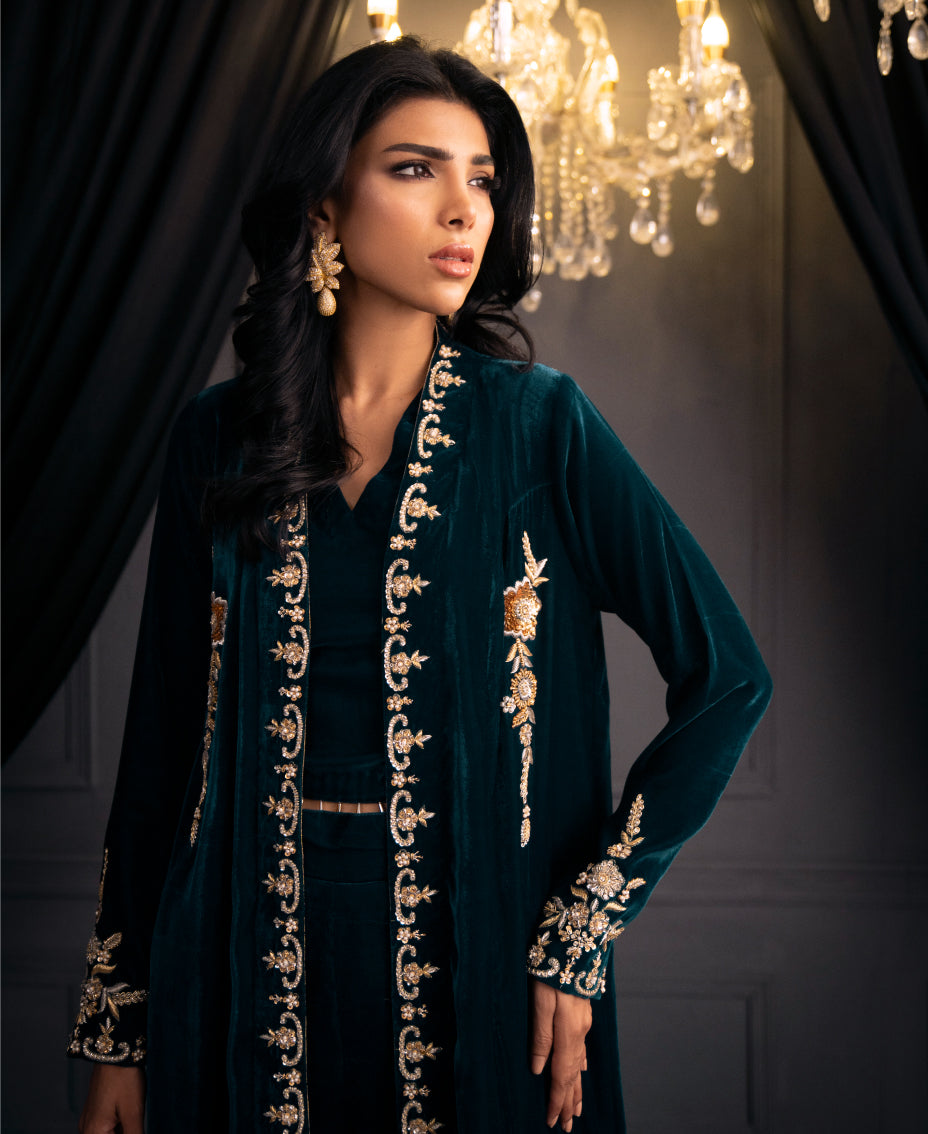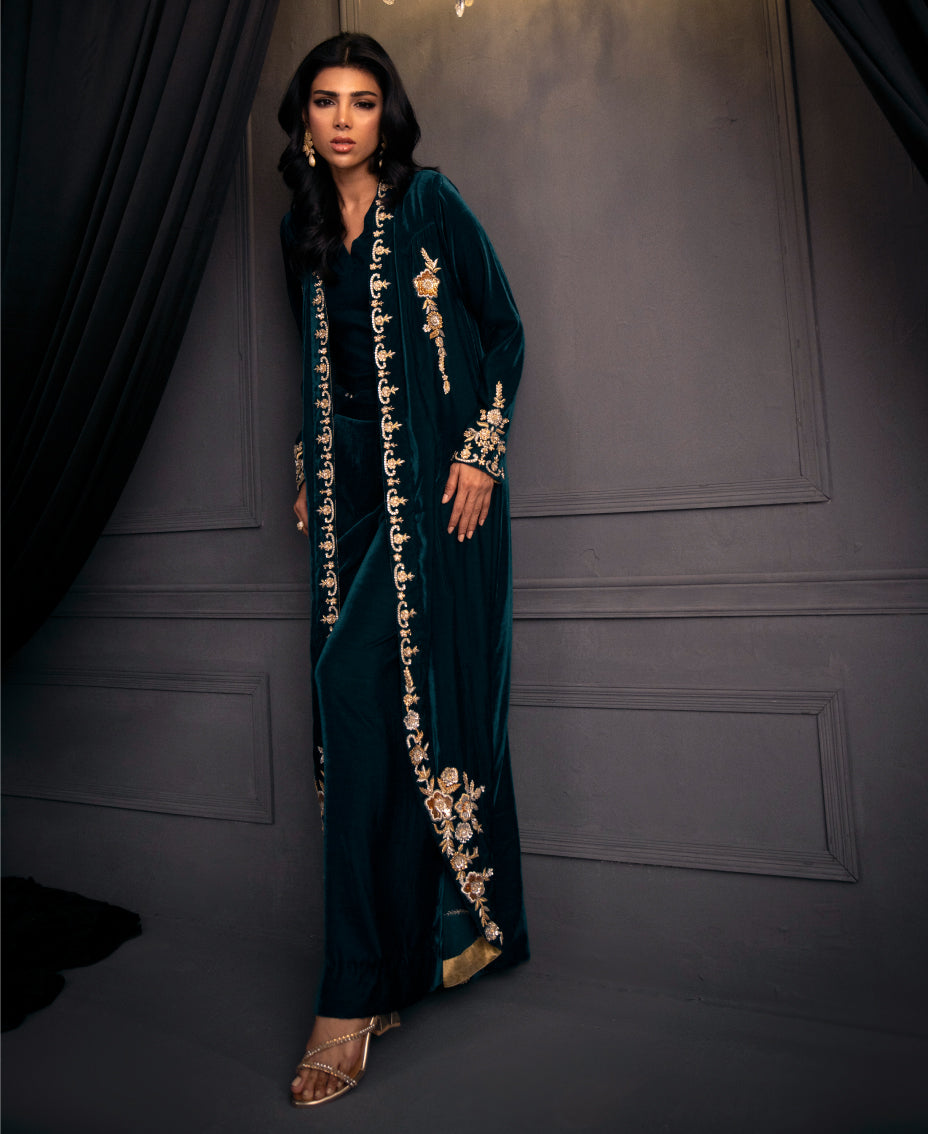 The mesmerizing teal blue velvet formal outfit ensemble of a long shrug with round edge and matching wide-leg pants. The shrug features intricate gold embroidery along its edges and sleeves, adding a touch of luxury. paired with a fitted top underneath, cinched at the waist with tassels on its hem. The outfit's  creating a cohesive and elegant look perfect for a formal or festive occasion. The overall effect is sophisticated and eye-catching, highlighting the beauty of traditional attire with a modern twist.