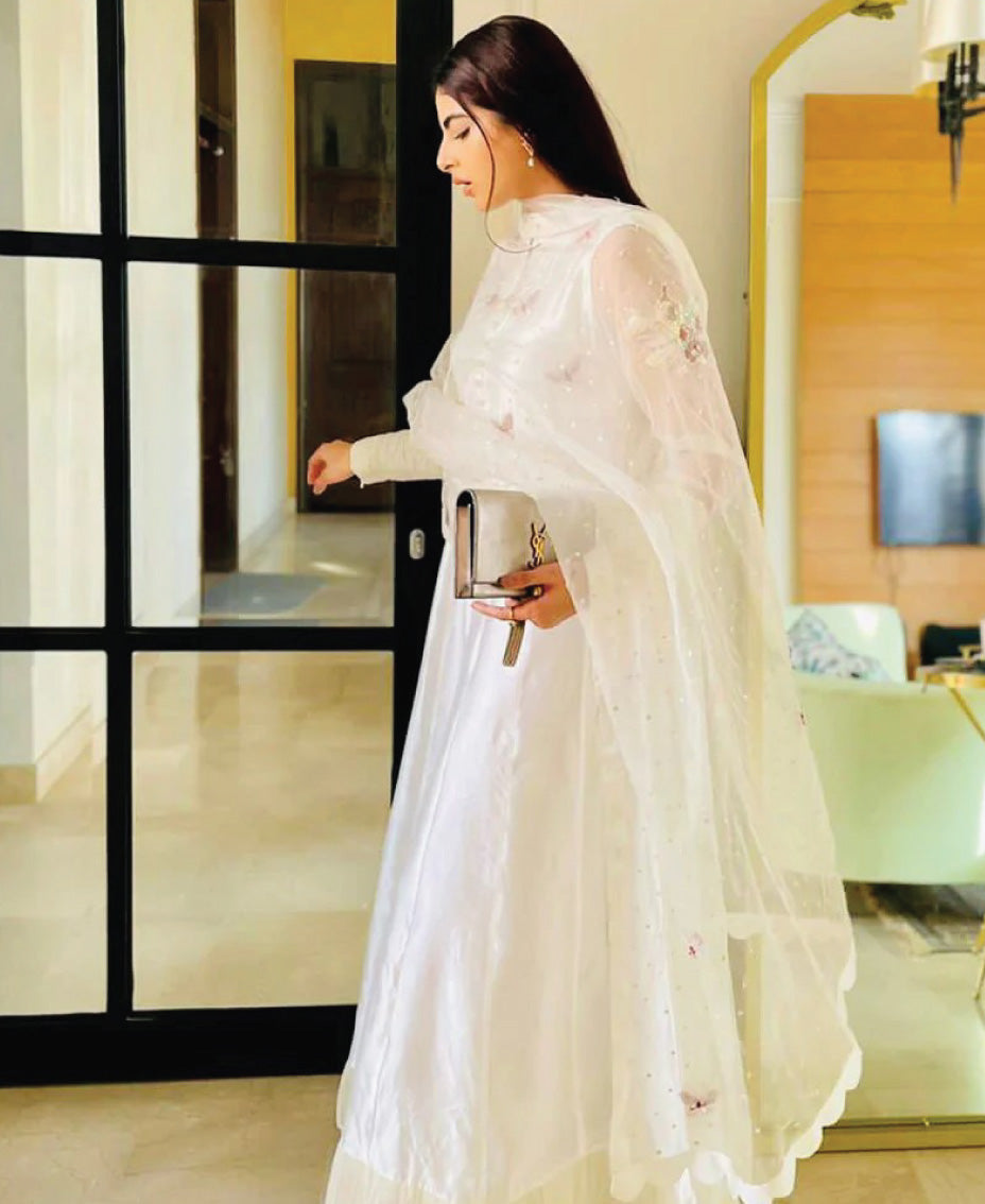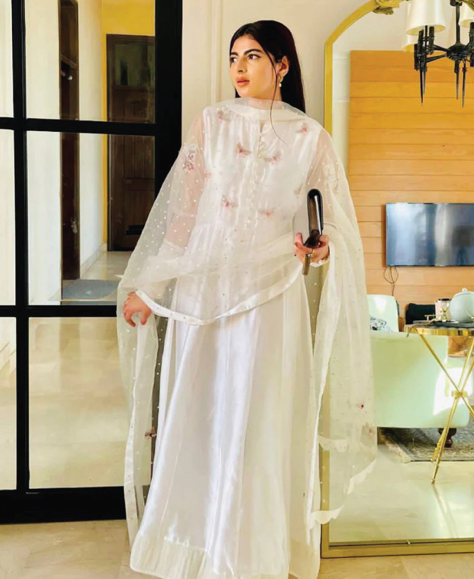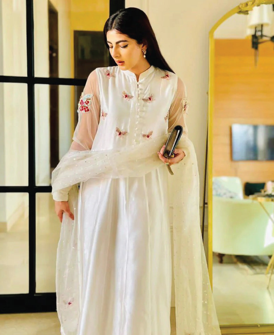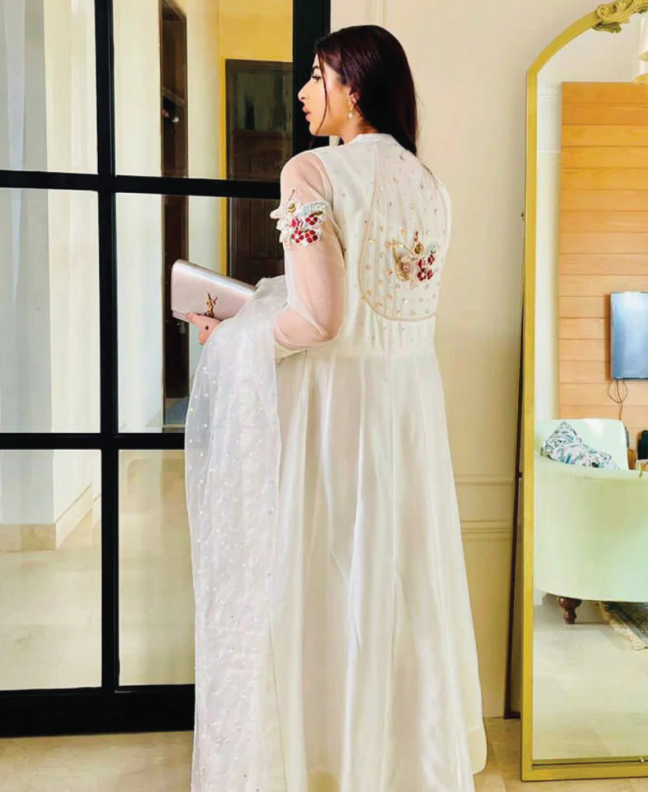 Dil Awaiz | This White Kalidar is cut from the finest silk with embroidery on the front and the most beautifuly crafted butterfly with the work of zardozi tilla and resham on sleeves. The outfit is finished with zari net in the most beautiful way.