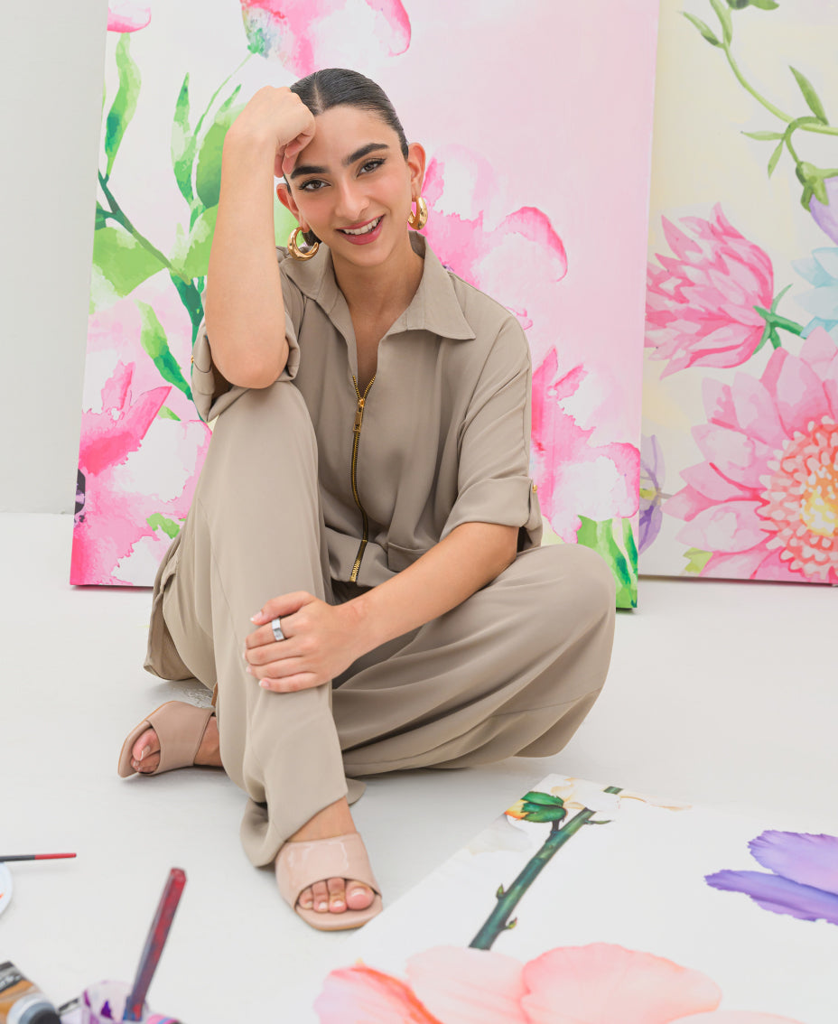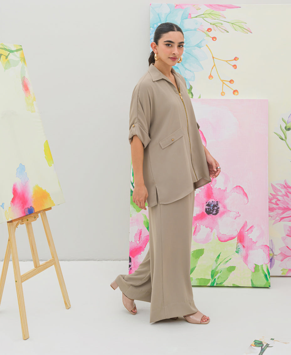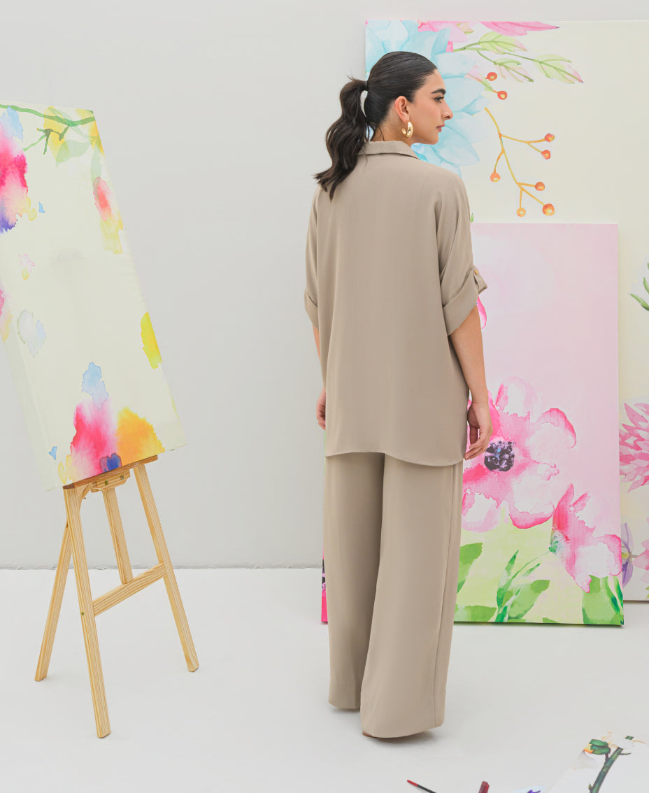 This classy beige premium Georgette drop shoulder co-ord along with folded cuff kimono elbow length sleeves, v- neck collar and a gold.