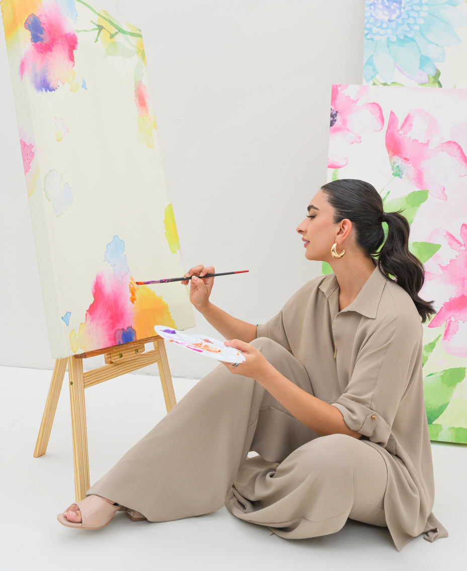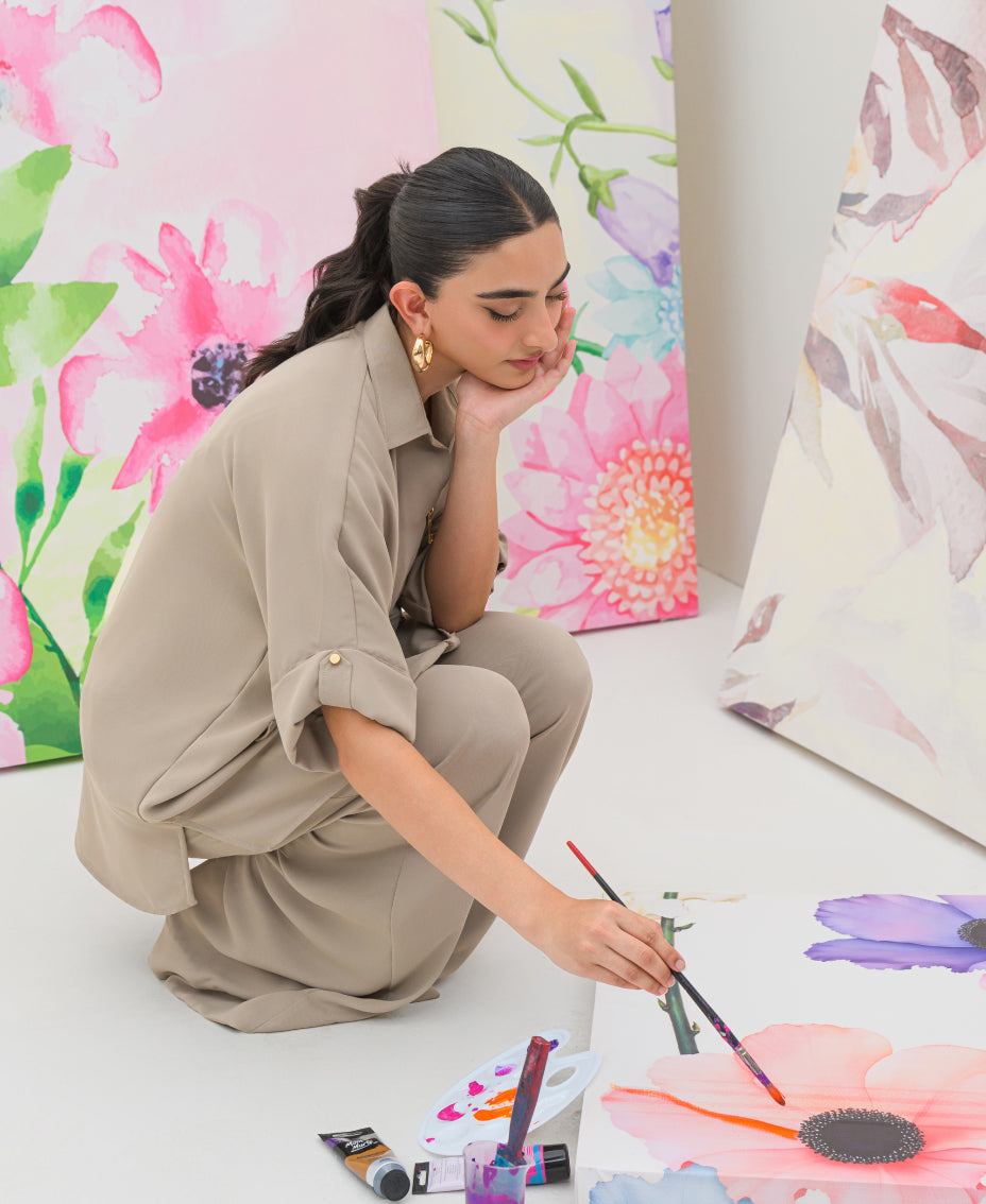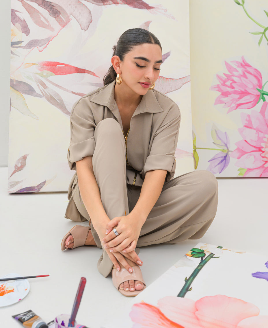 This classy beige premium Georgette drop shoulder co-ord along with folded cuff kimono elbow length sleeves, v- neck collar and a gold.