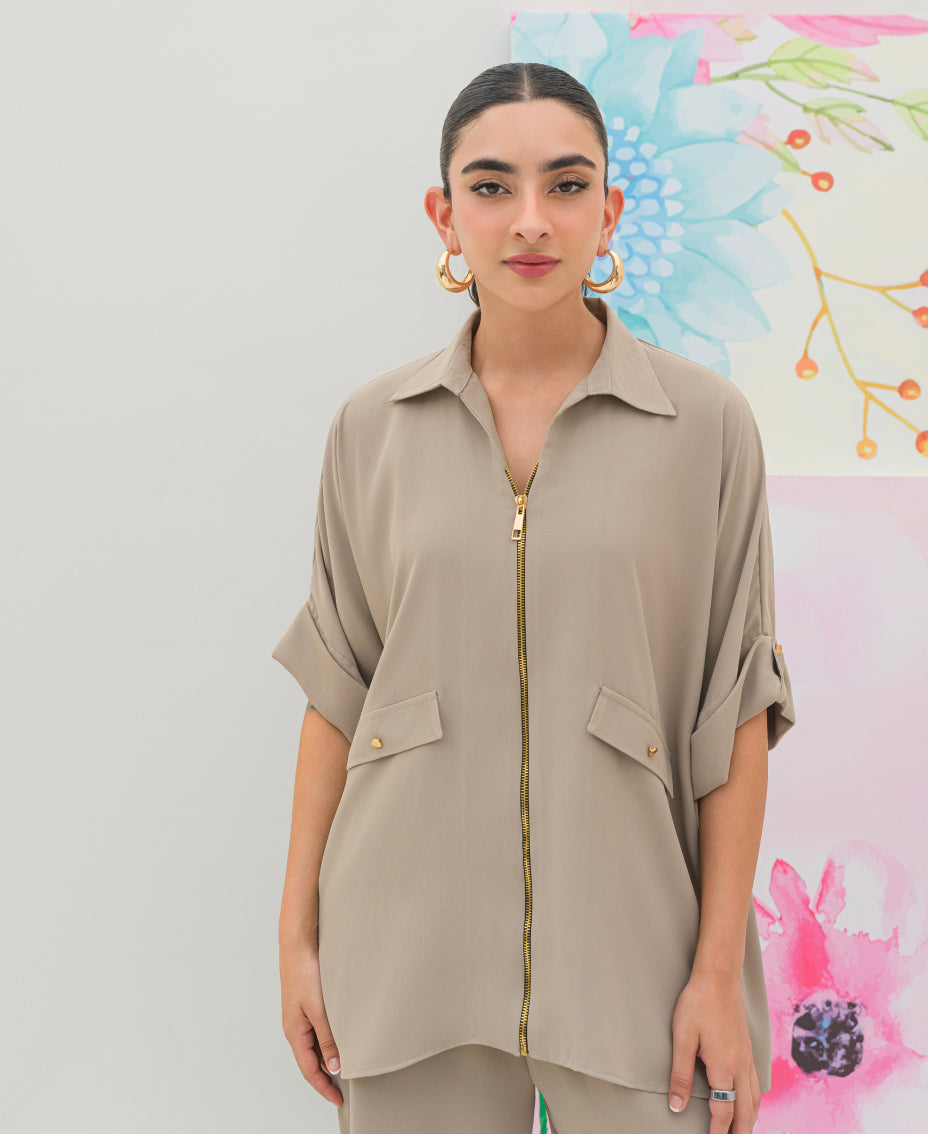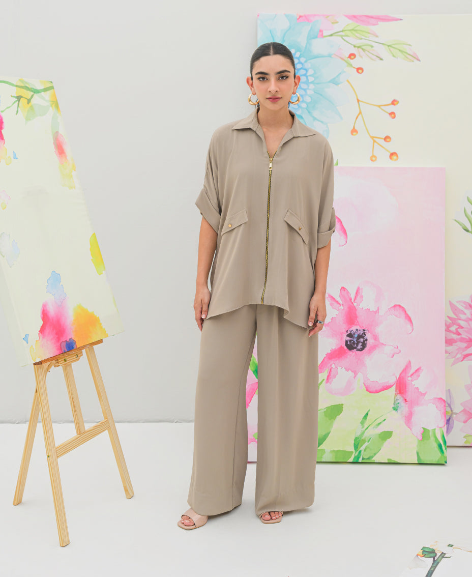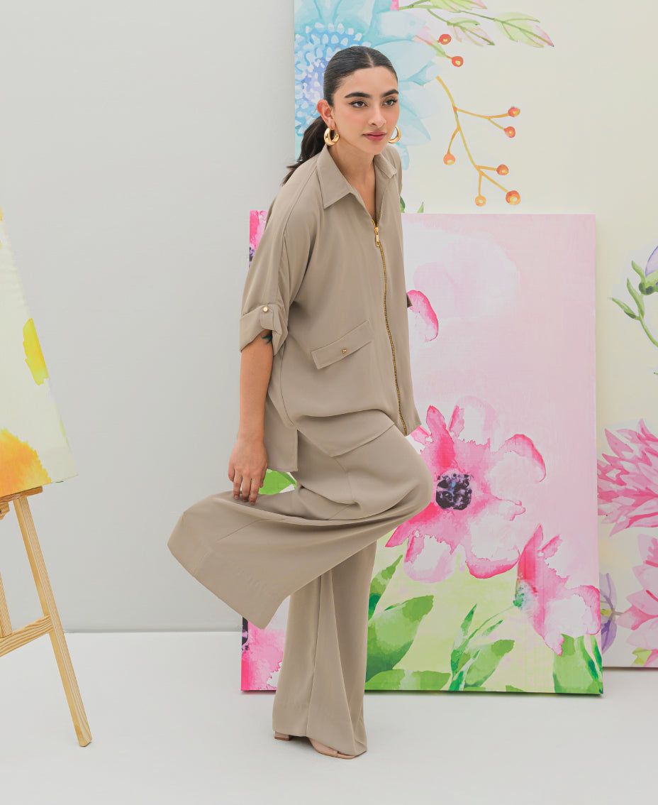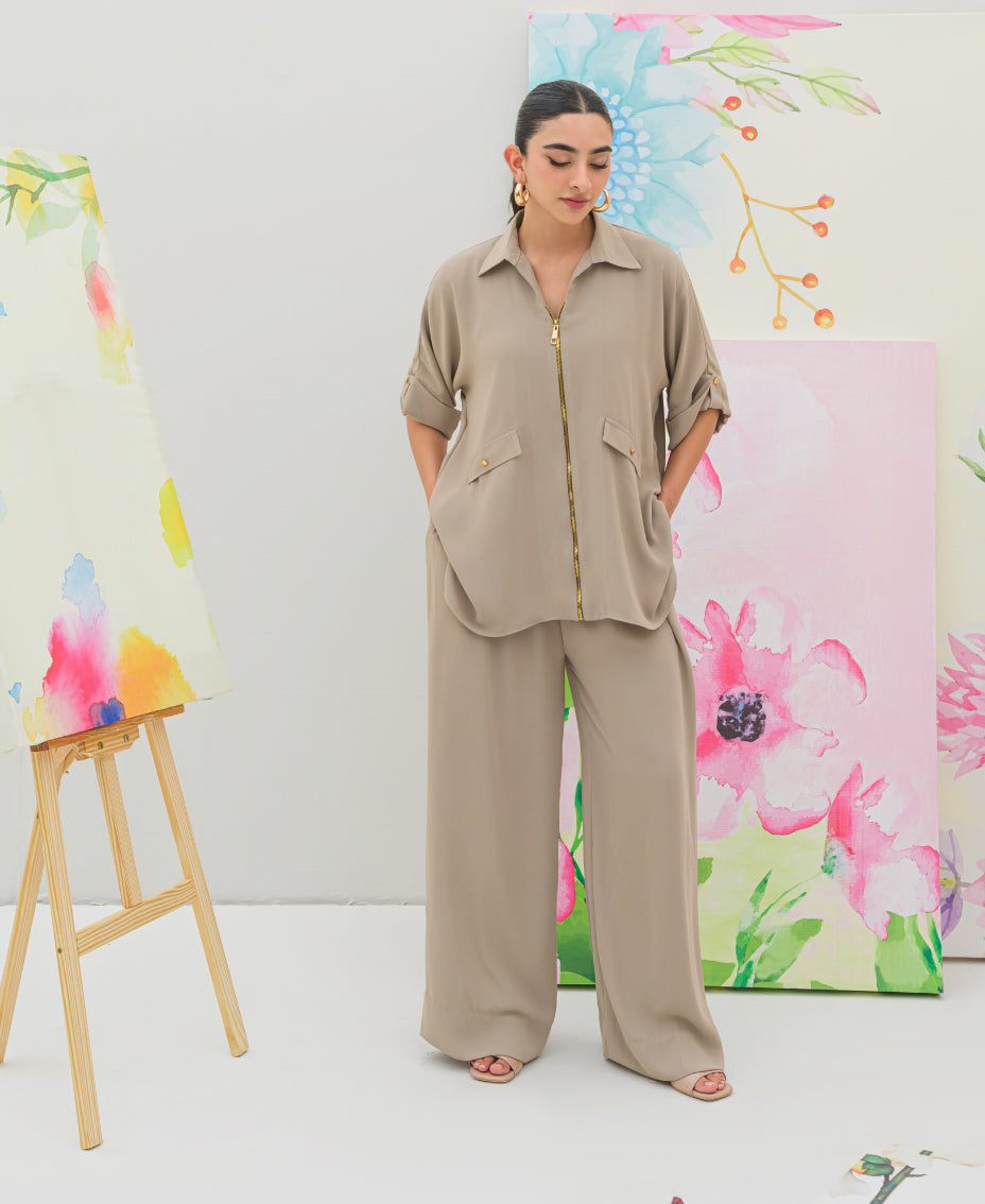 zipper on the front with two diagonal pocket on the center of the waist, paired with wide leg pants giving it a more classy look.