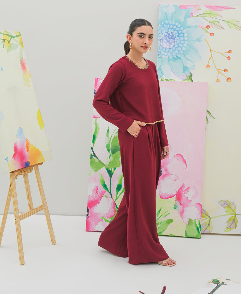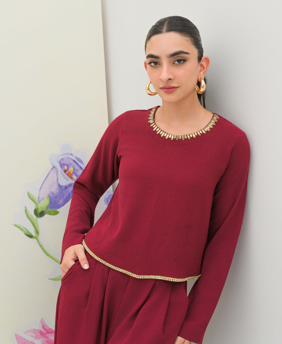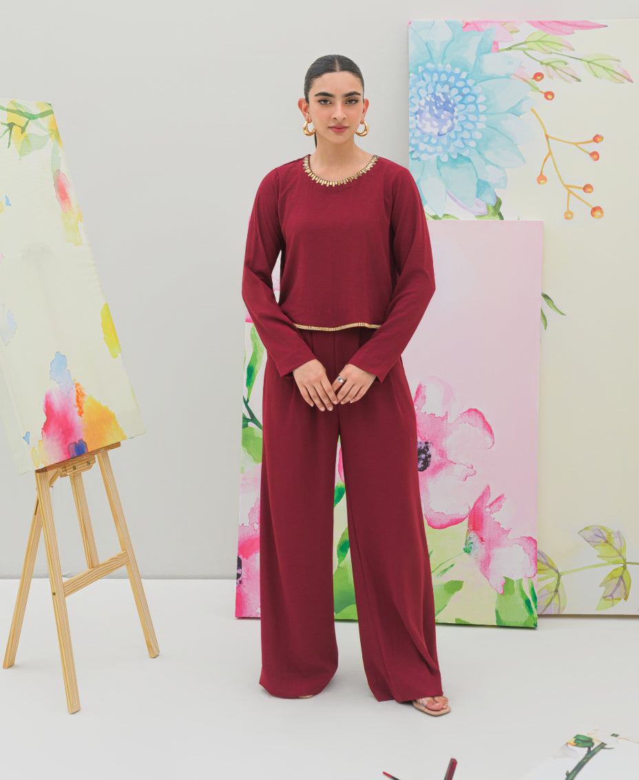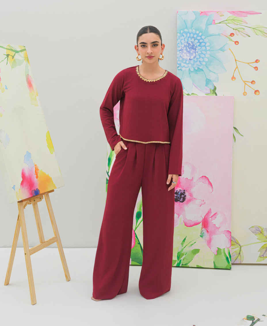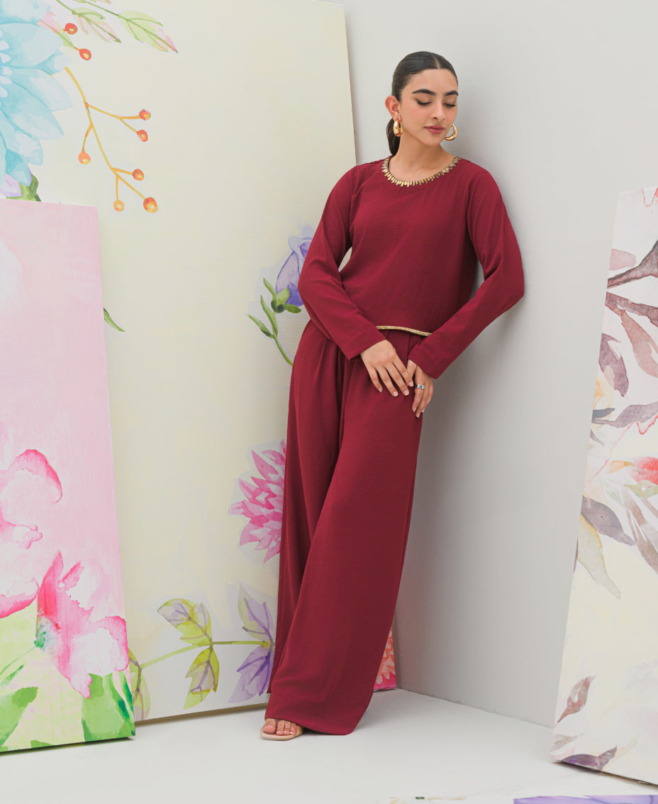 The maroon Georgette co-ord features a waist-length shirt along with a hand embellished boat neck with crystals stones and a delicate hand embellished lace with crystal stone on the hem paired with a high waist box pleated flared pants.