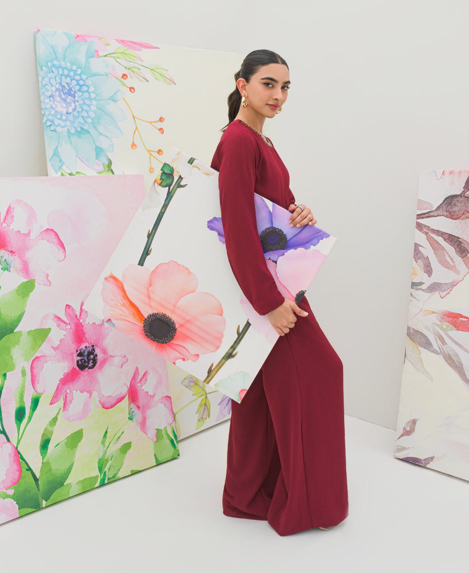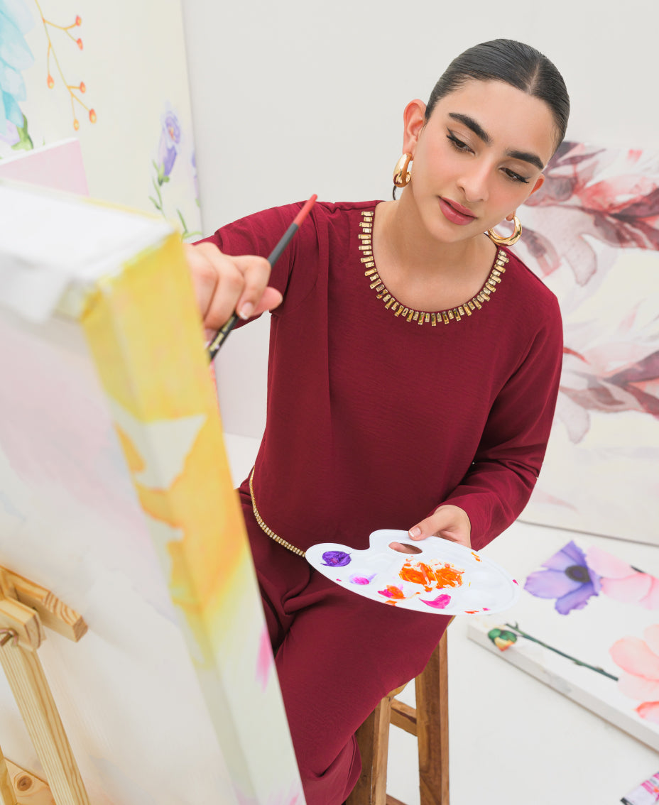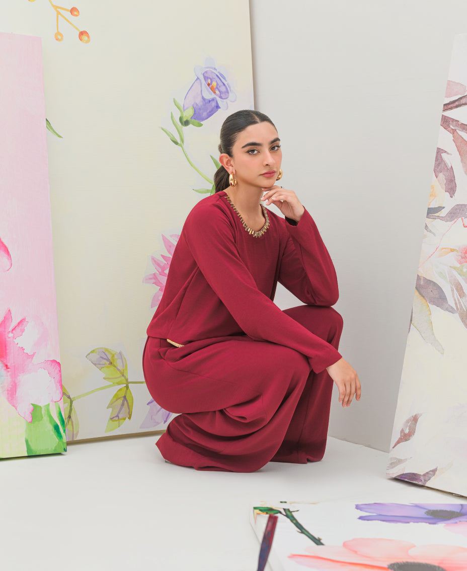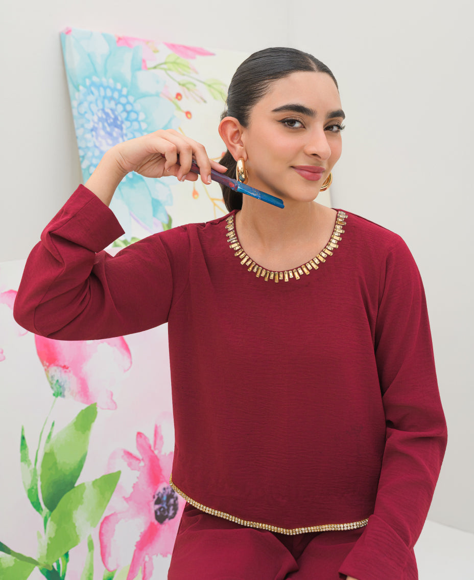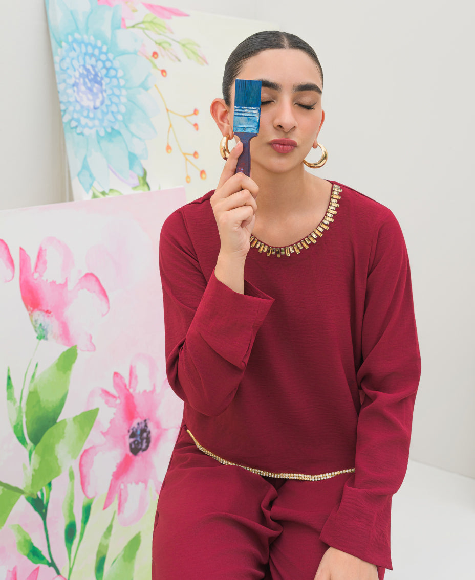 The maroon Georgette co-ord features a waist-length shirt along with a hand embellished boat neck with crystals stones and a delicate hand embellished lace with crystal stone on the hem paired with a high waist box pleated flared pants.