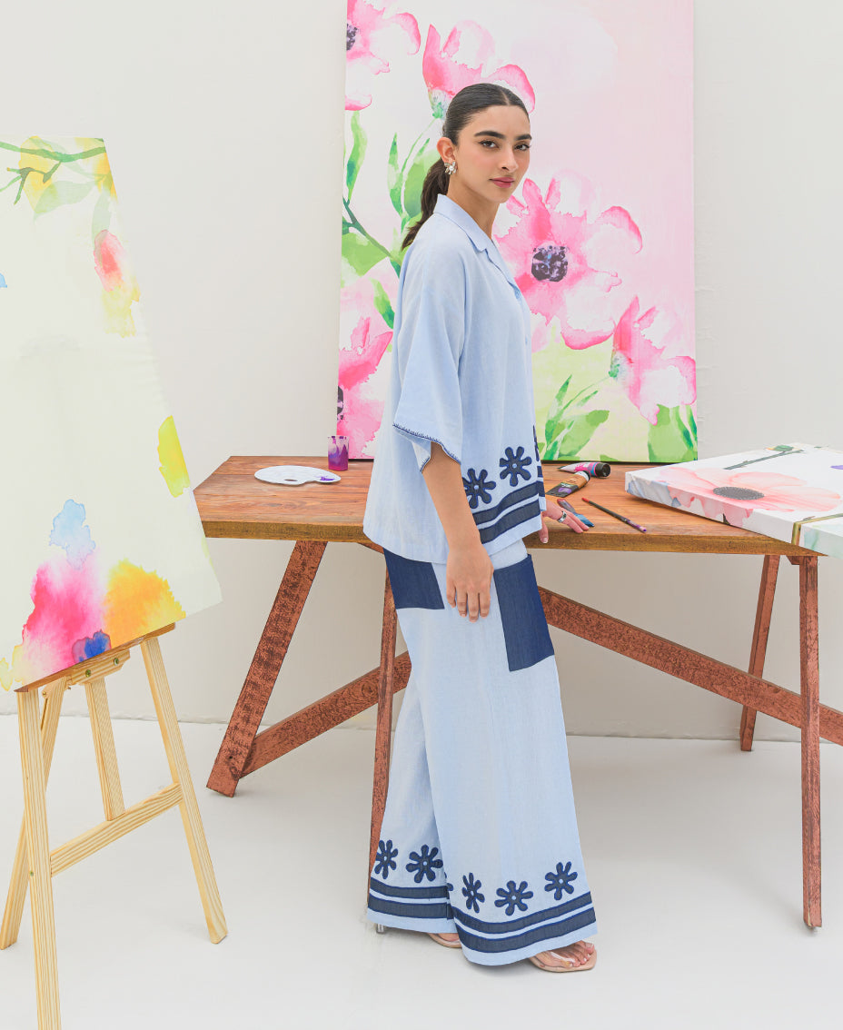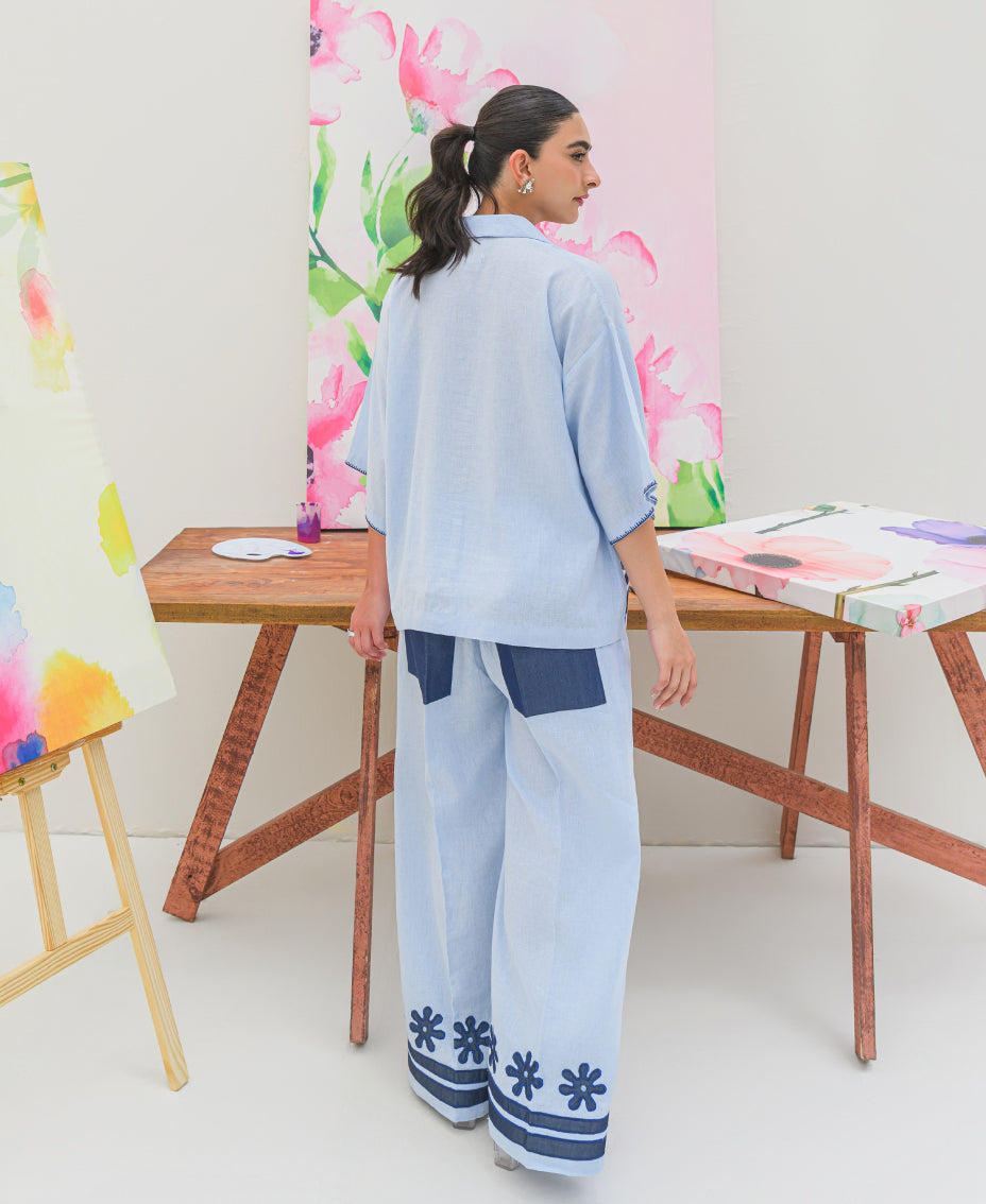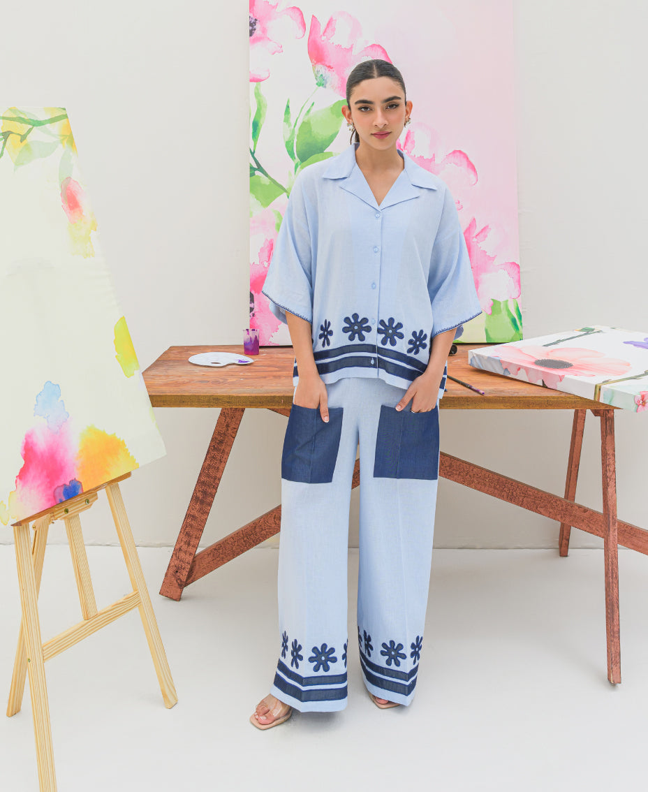 Elevate your style with this relaxed-fit Irish blue cord set adorned with charming chambray appliques and a sophisticated notched open collar. Paired with matching pants featuring matching applique details, this outfit exudes effortless elegance.
