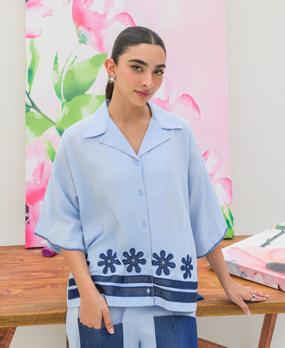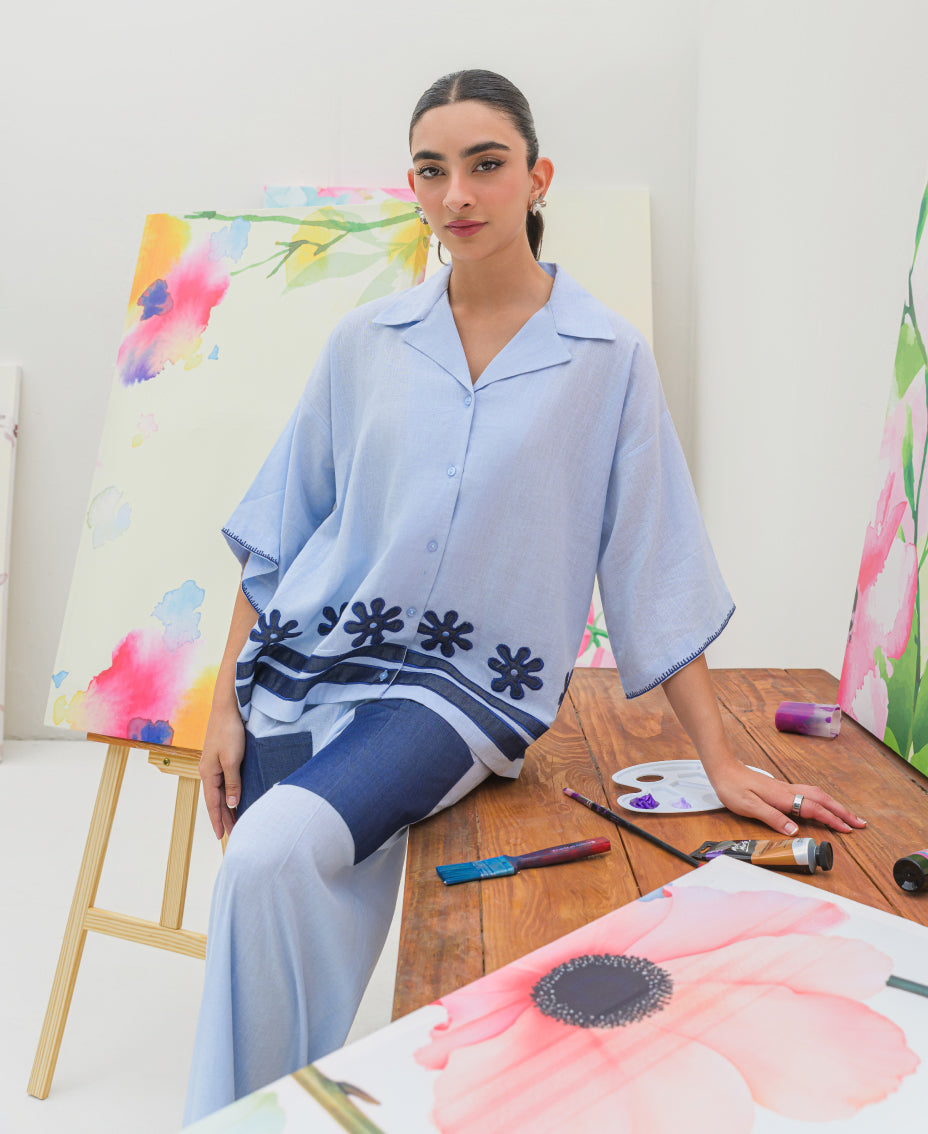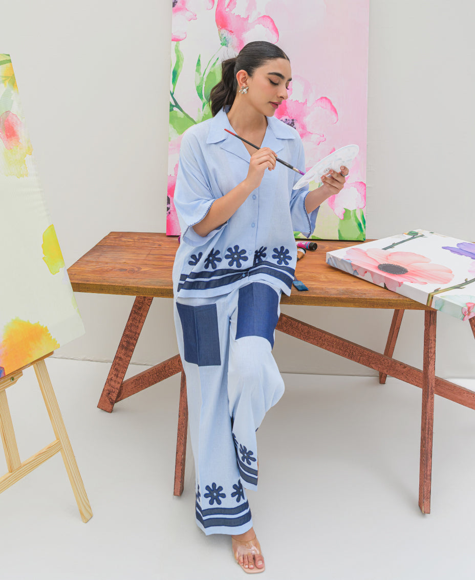 Elevate your style with this relaxed-fit Irish blue cord set adorned with charming chambray appliques and a sophisticated notched open collar. Paired with matching pants featuring matching applique details, this outfit exudes effortless elegance.