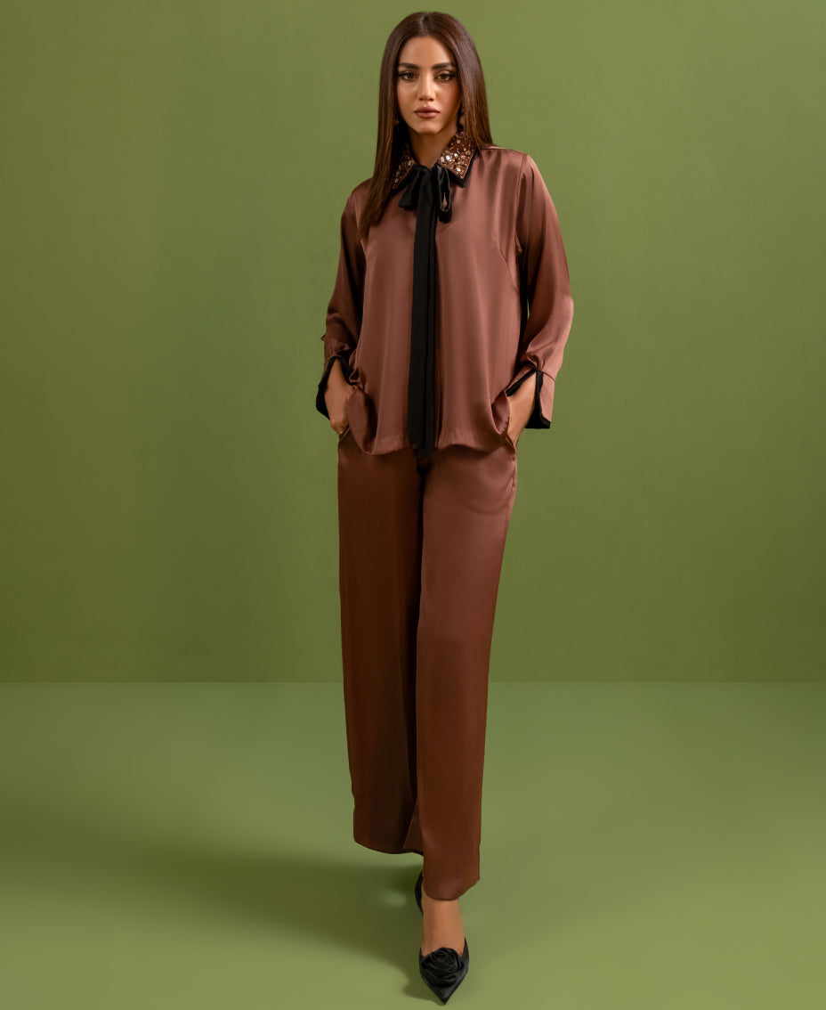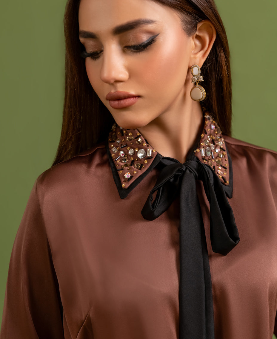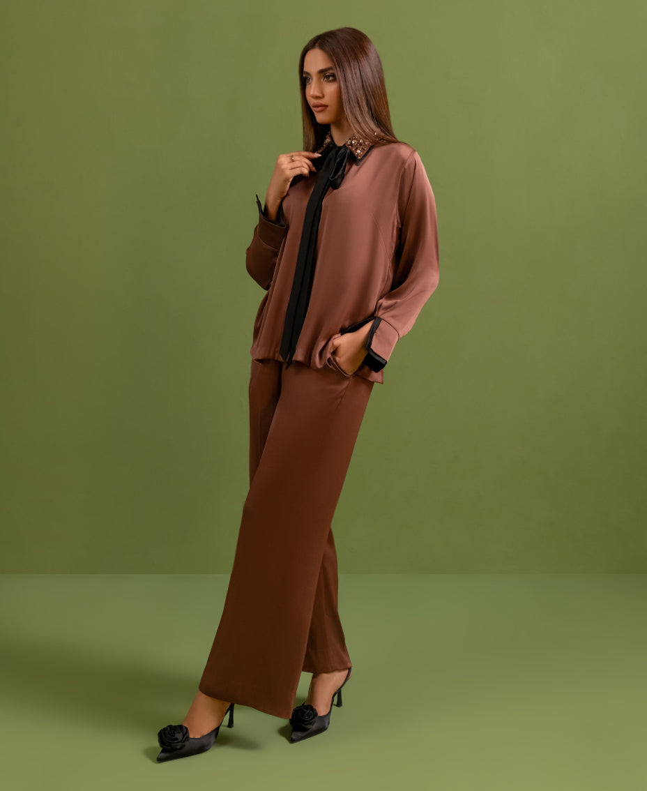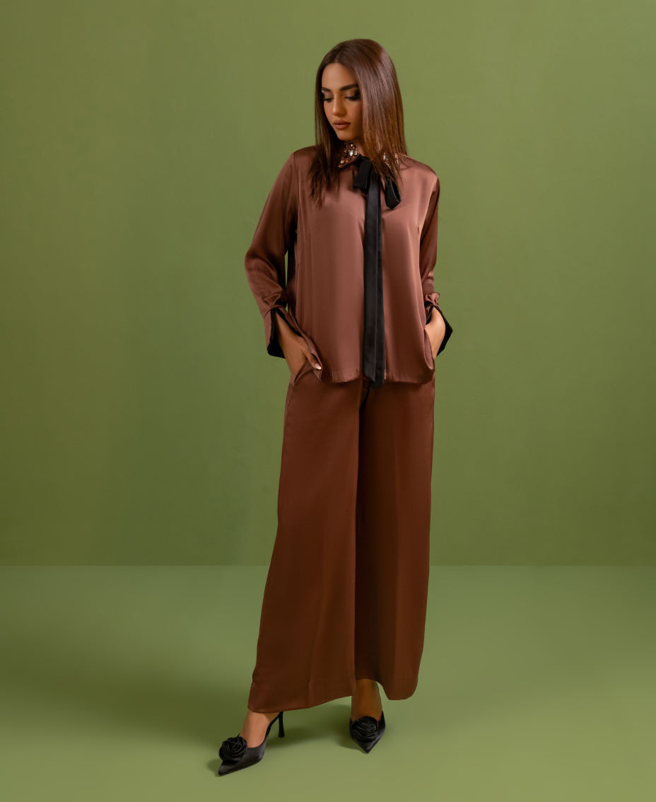 Elevate your style with this sophisticated chocolate brown ensemble, expertly adorned with intricate stone handwork on the double-collared shirt. Paired with tailored shirt and flowy pants, this look is perfected with a chic bow tie, exuding the ultimate 'boss lady' confidence.