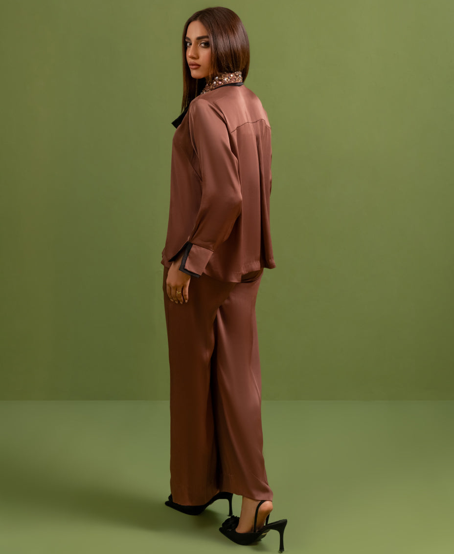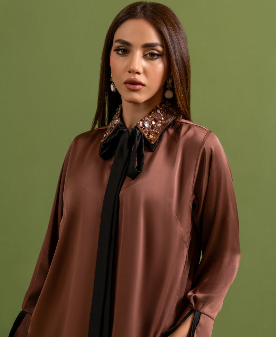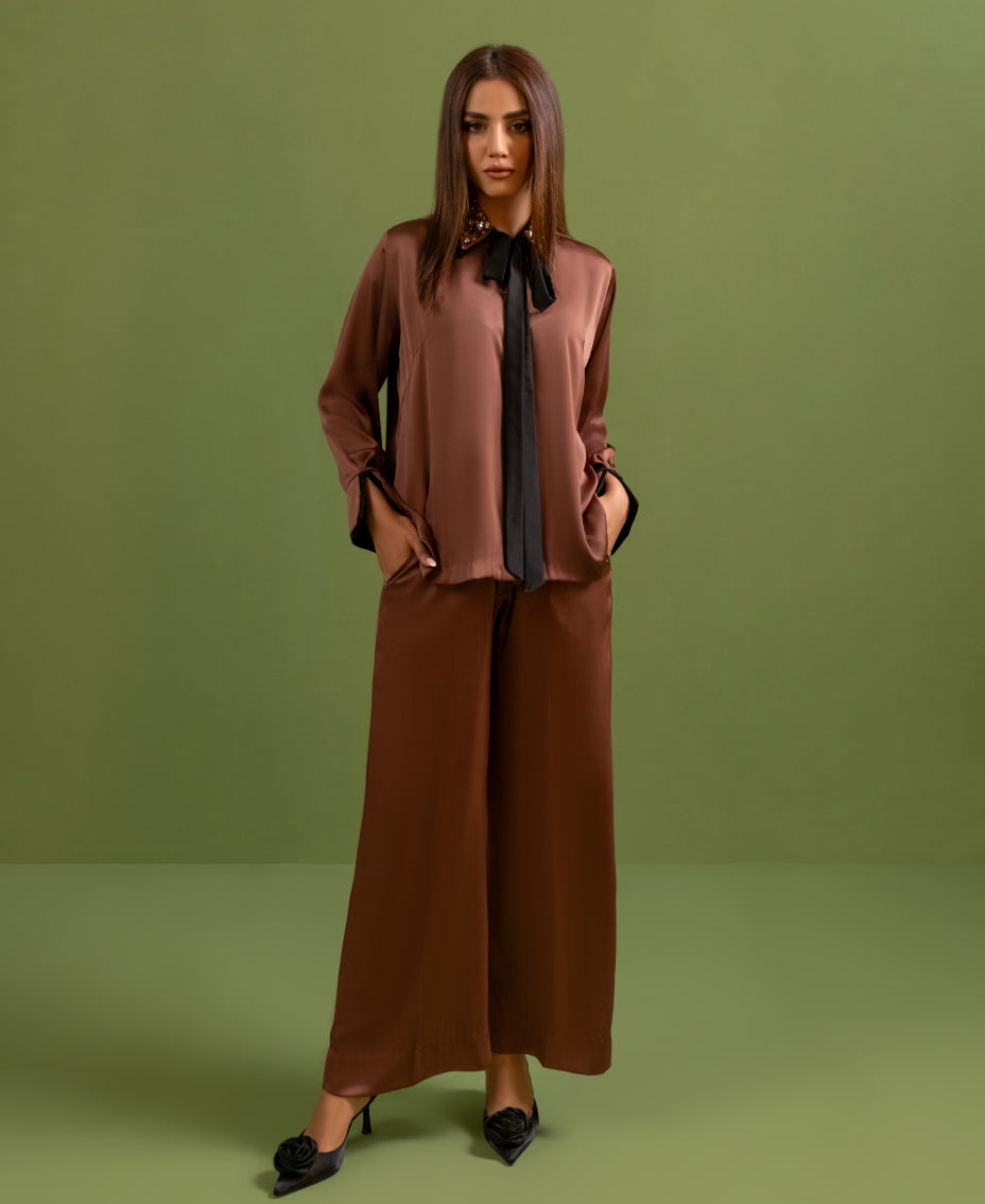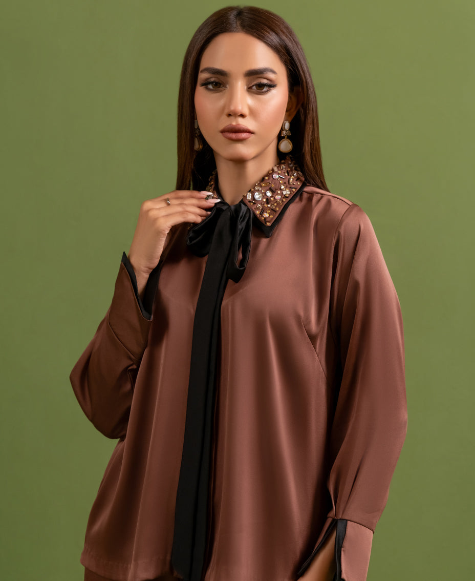 Elevate your style with this sophisticated chocolate brown ensemble, expertly adorned with intricate stone handwork on the double-collared shirt. Paired with tailored shirt and flowy pants, this look is perfected with a chic bow tie, exuding the ultimate 'boss lady' confidence.