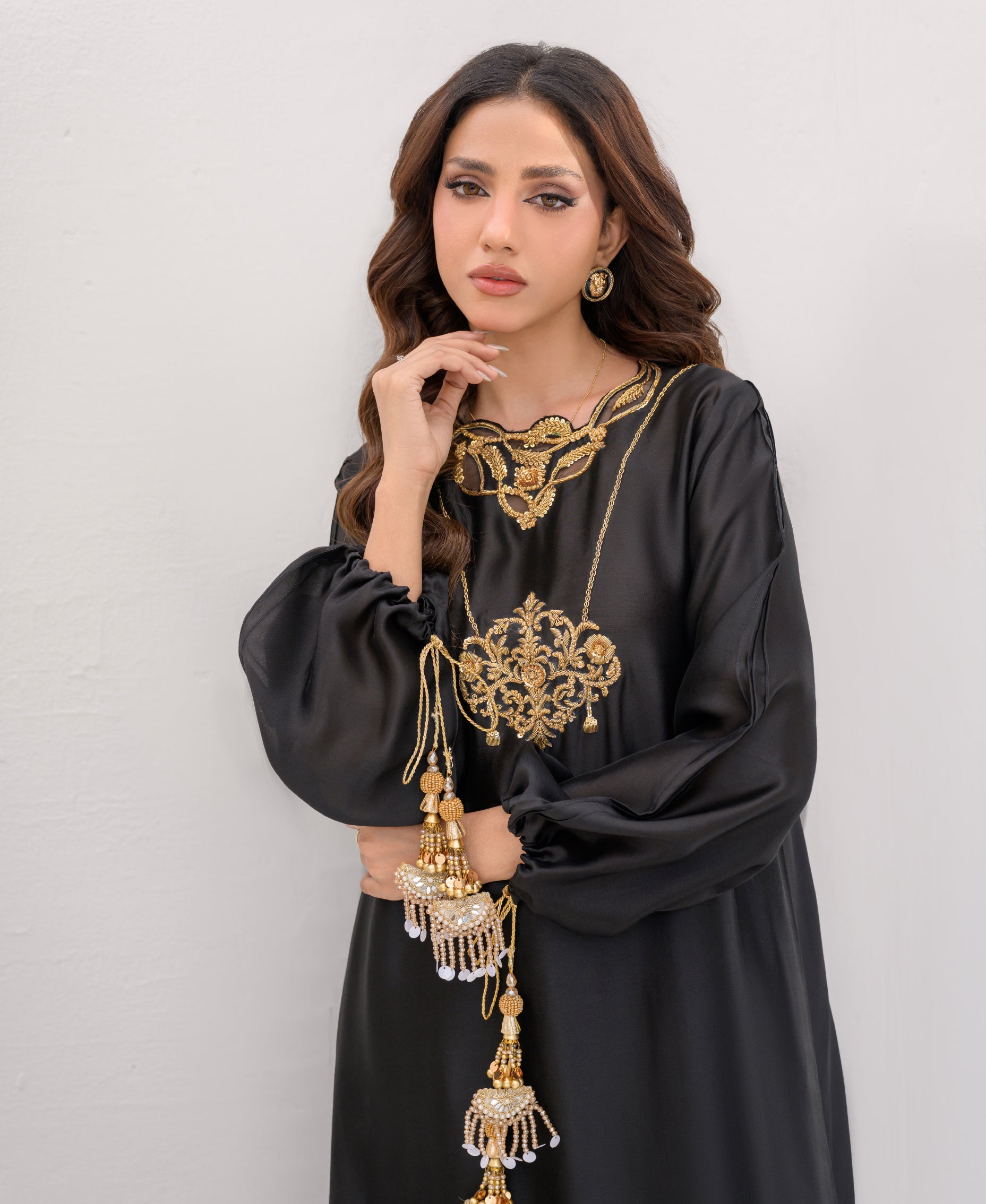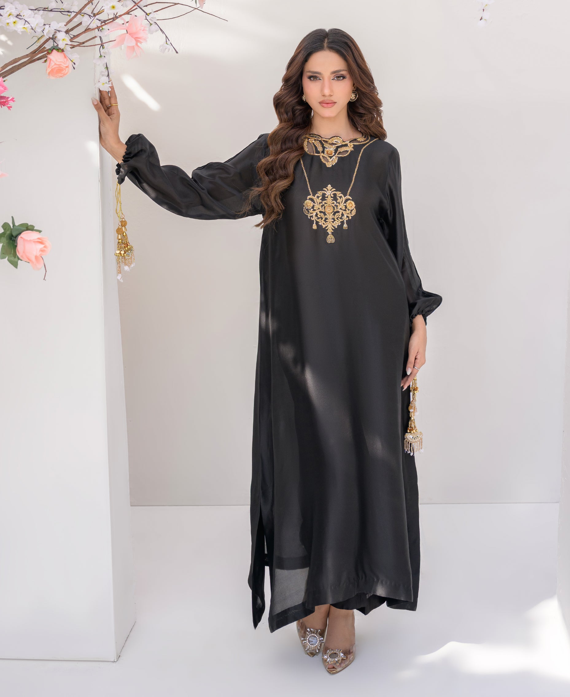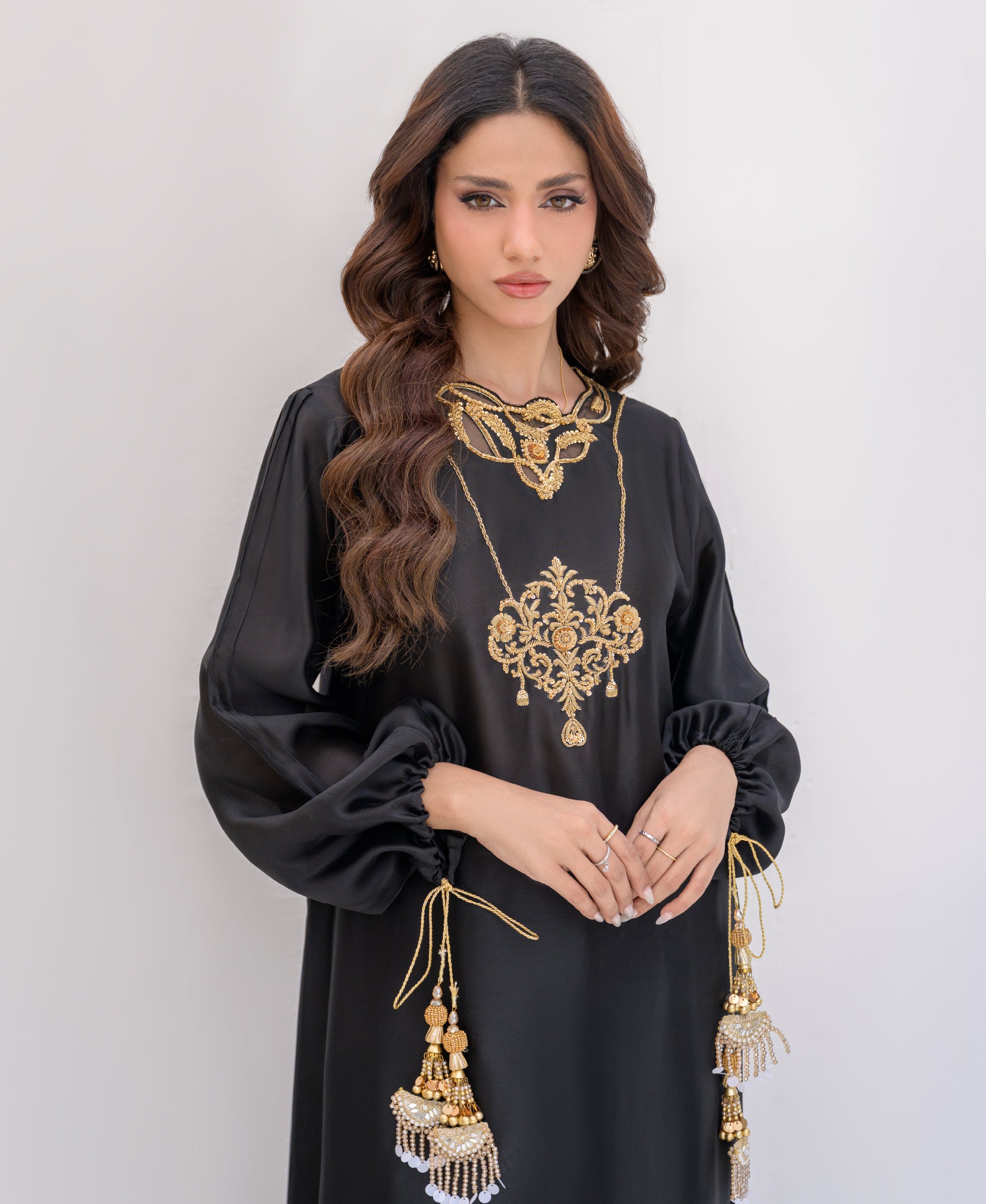 Ezel is defined by statement kora dabka detailing, set against a calm, elongated silhouette crafted in pure sheesha silk. The long shirt features a refined jeweled motif along the neckline, finished with gold and pearl tassel accents that add a sense of movement and quiet drama.