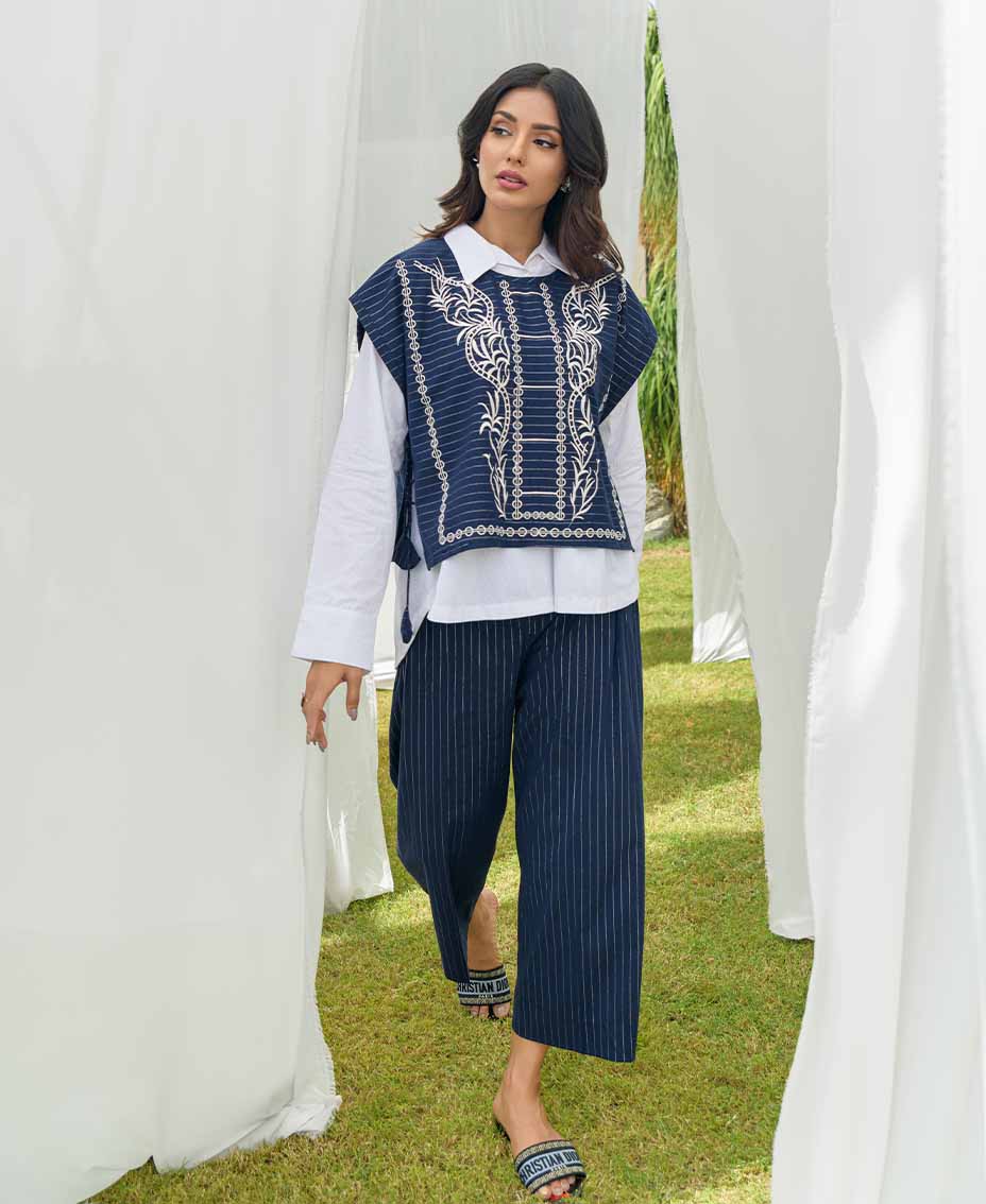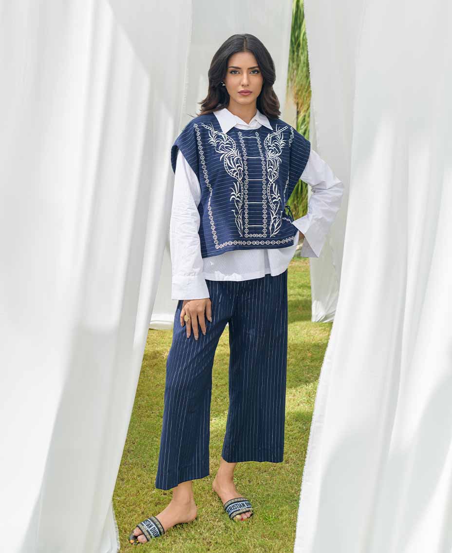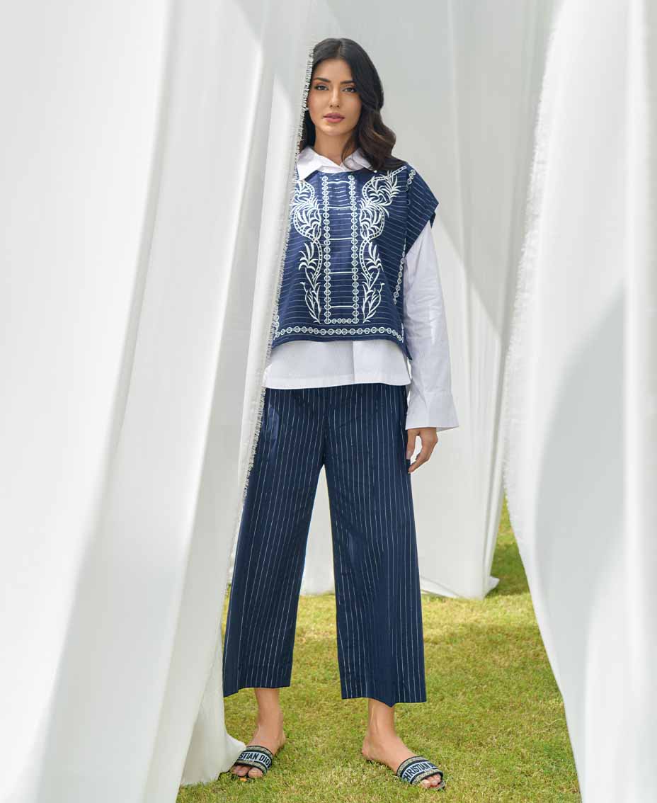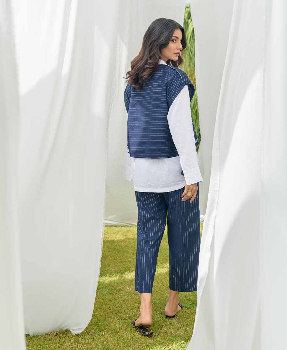 This article features a stylish blue striped cotton vest, elegantly paired with matching flared pants. The vest is adorned with intricate embroidery and charming tassels on the sides, adding a playful touch. A classic white Irish shirt complements the look, offering a fresh contrast. Ideal for both casual outings and dressier occasions, this ensemble exudes effortless style.