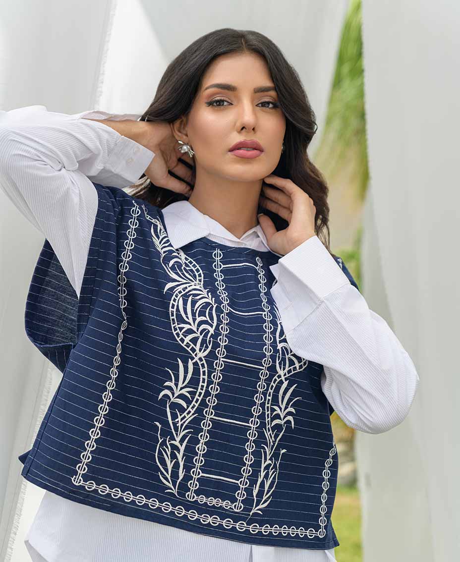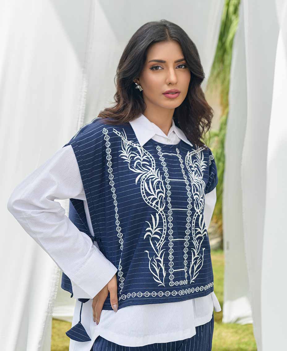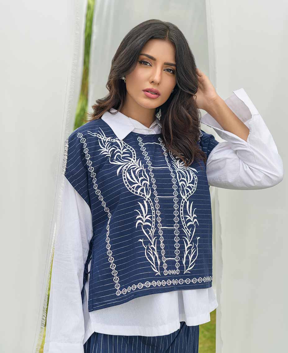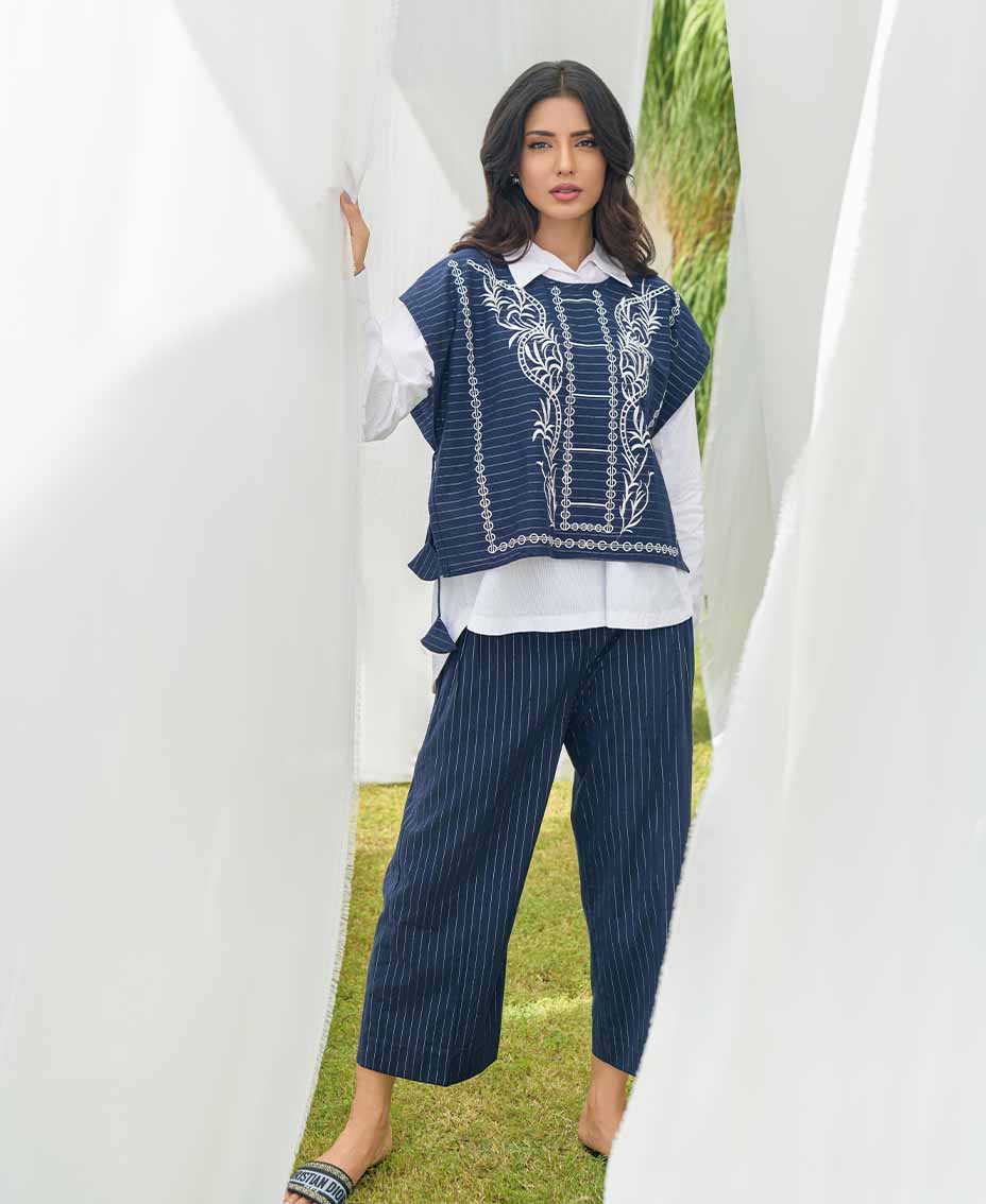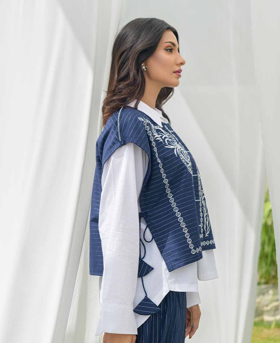 This article features a stylish blue striped cotton vest, elegantly paired with matching flared pants. The vest is adorned with intricate embroidery and charming tassels on the sides, adding a playful touch. A classic white Irish shirt complements the look, offering a fresh contrast. Ideal for both casual outings and dressier occasions, this ensemble exudes effortless style.