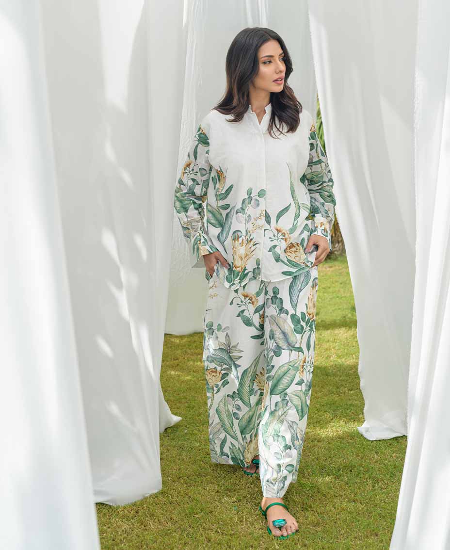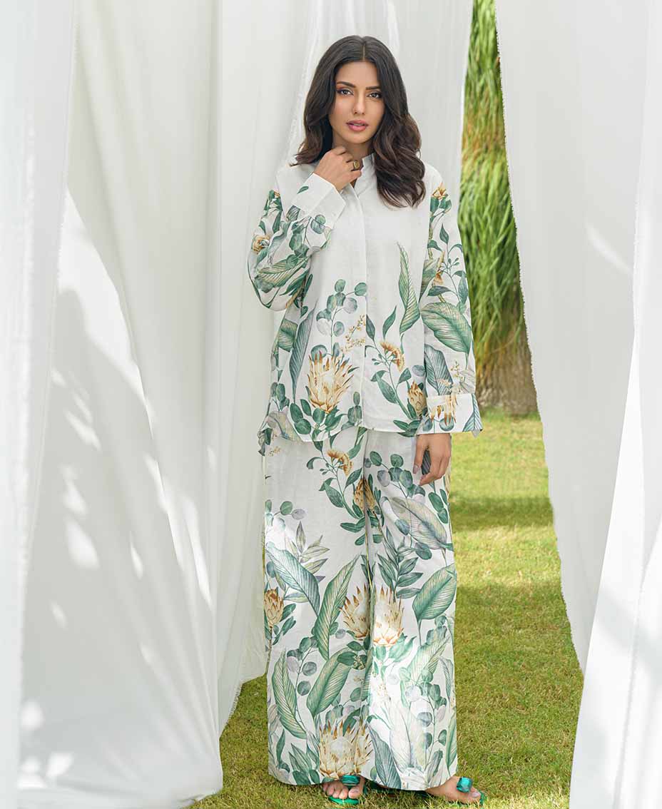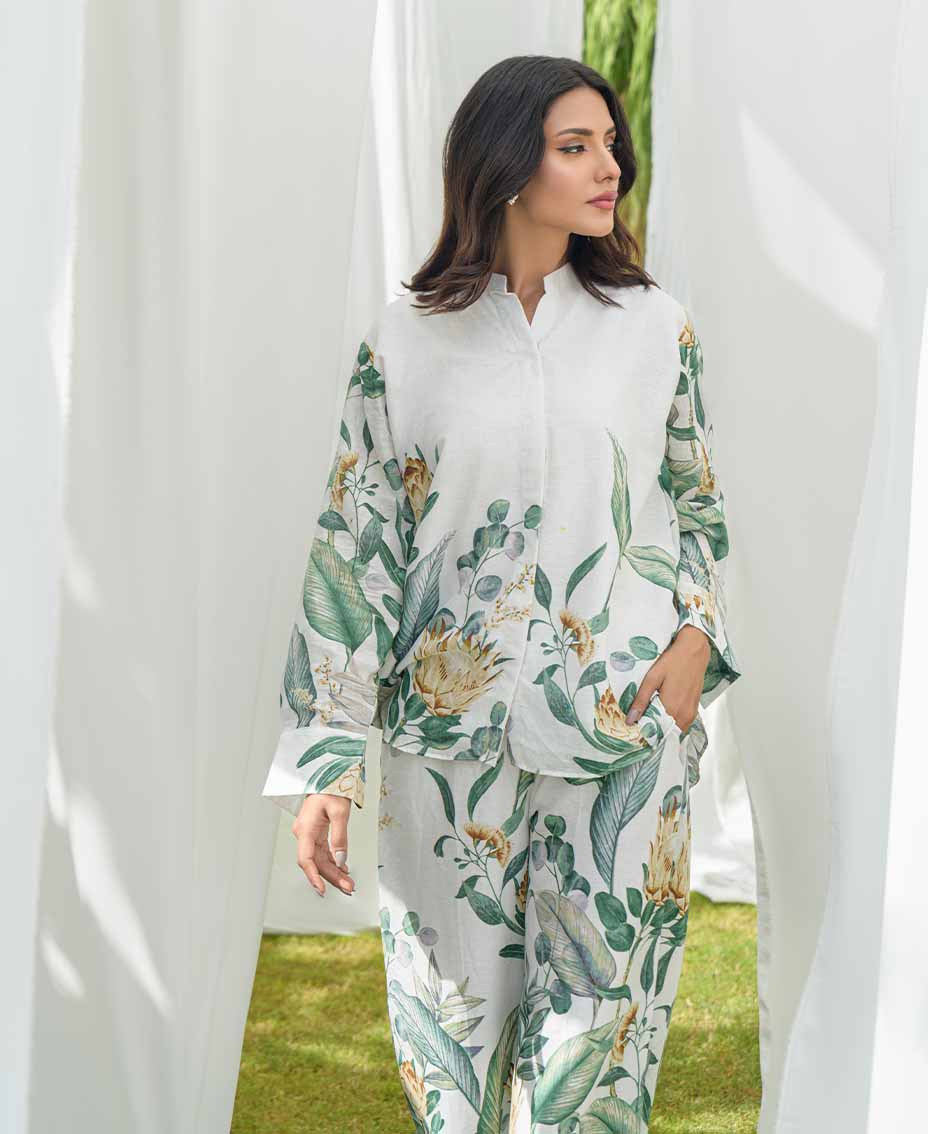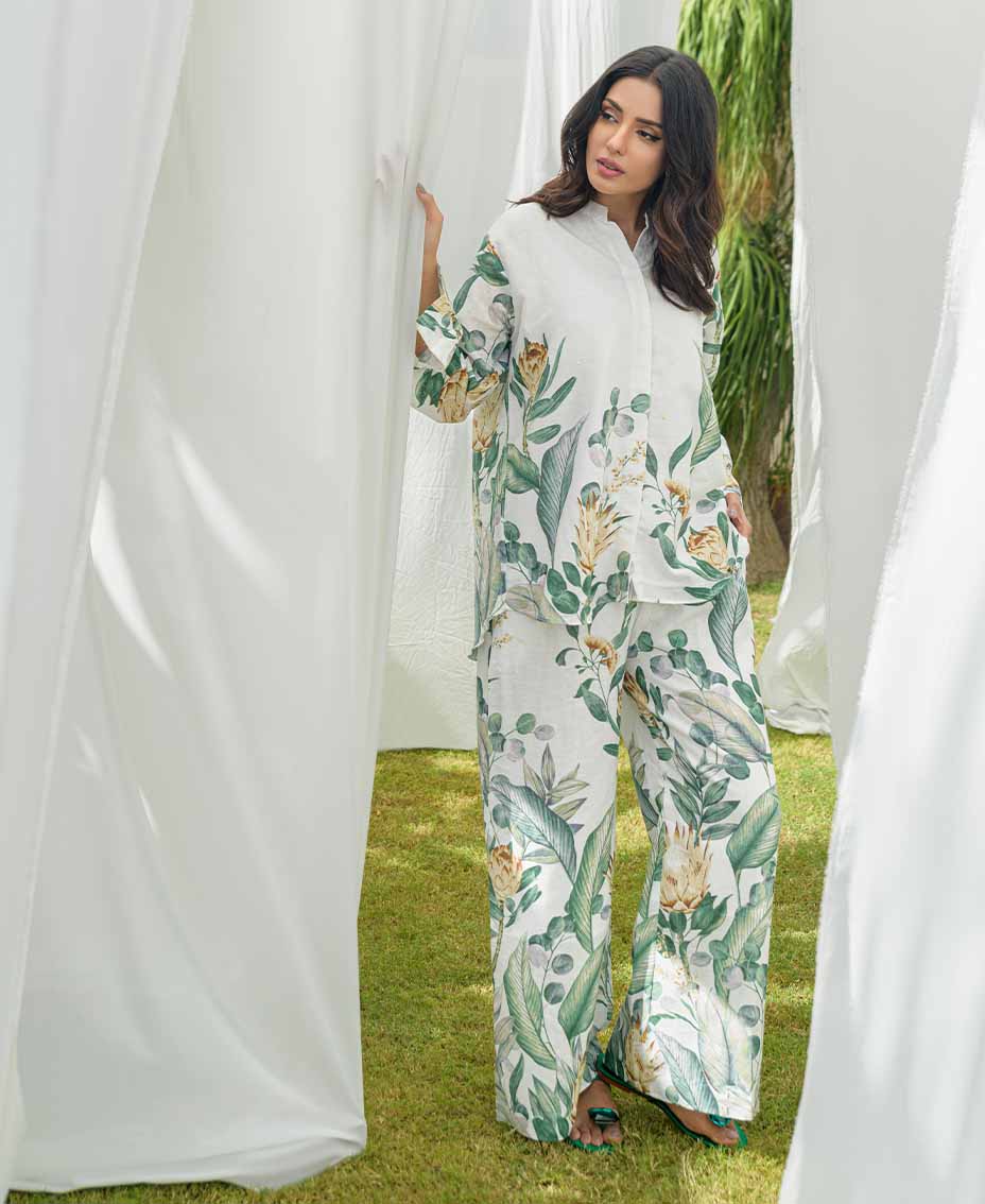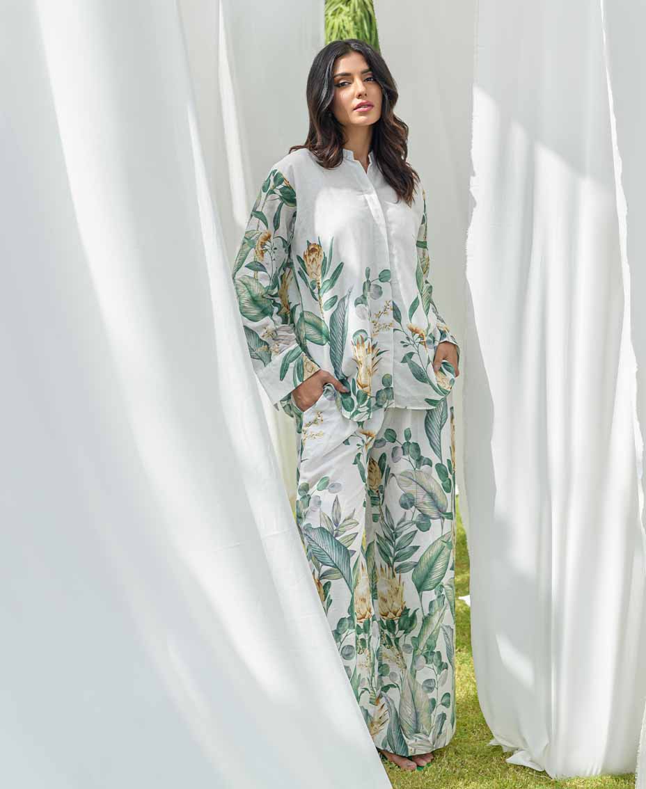 This stylish white co-ord set features a refreshing twist of green accents, on irish fabric, perfect for a relaxed and chic look. The loose-cut top offers a relaxed fit, ensuring comfort and ease of movement. Paired with flared pants, it creates a flattering silhouette that’s both trendy and chic. Crafted from lightweight fabric, it’s ideal for fall days or evenings. Effortlessly stylish, this set is a must-have for your fall wardrobe.