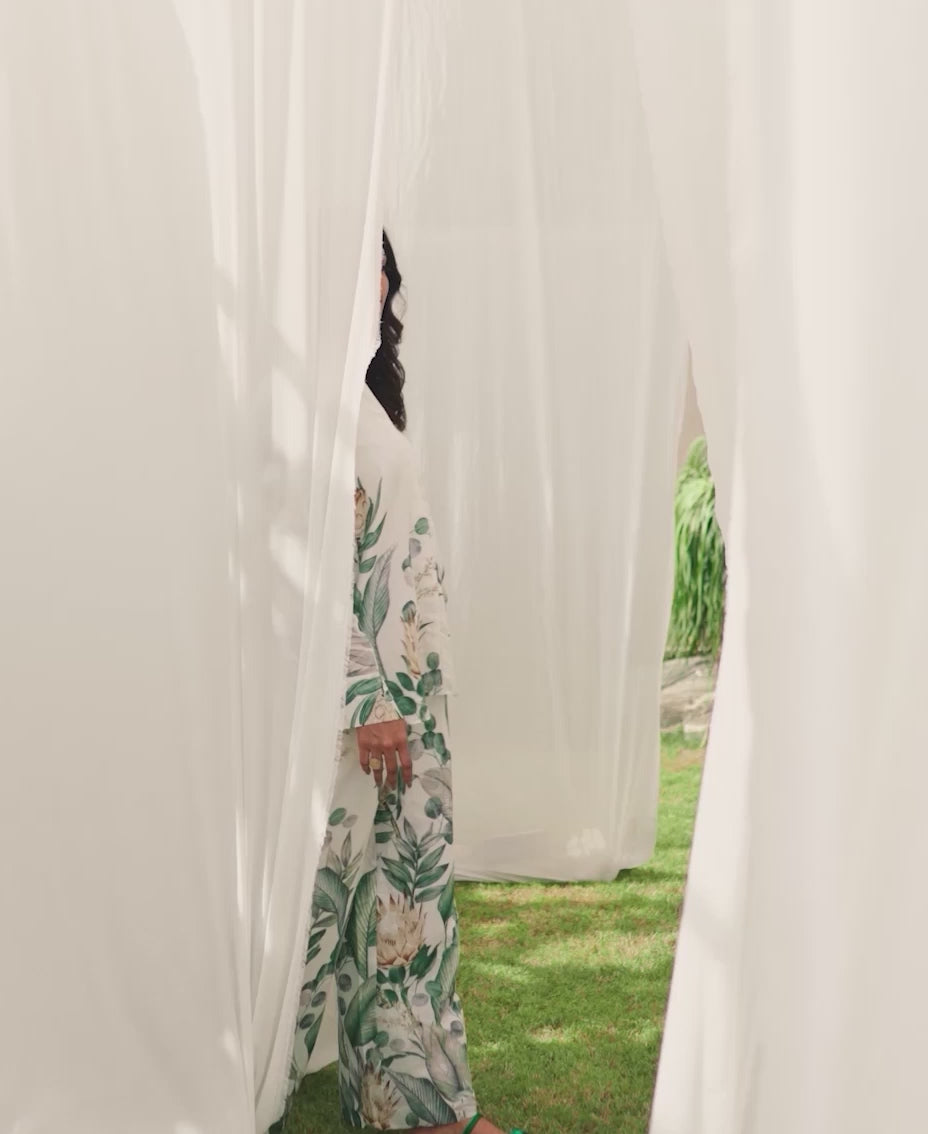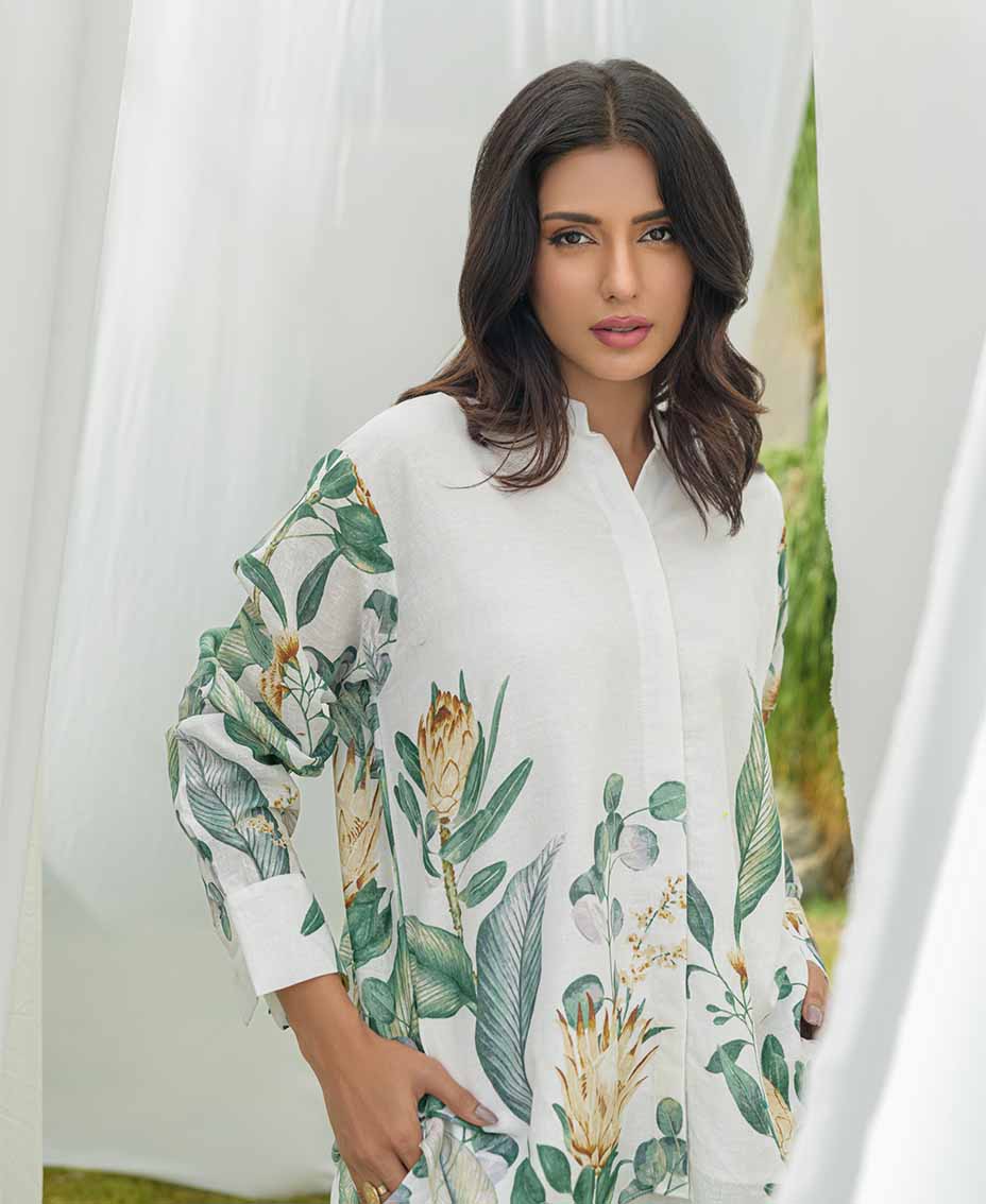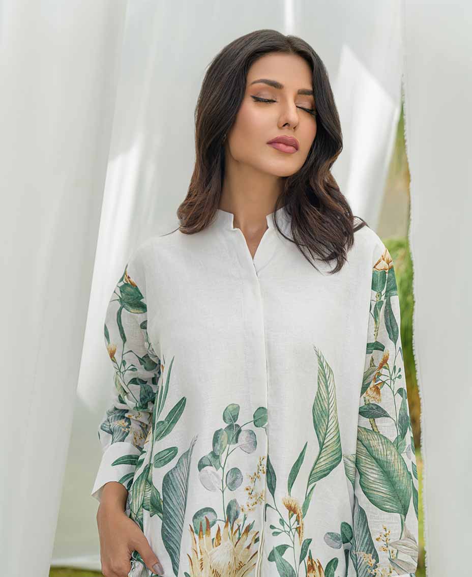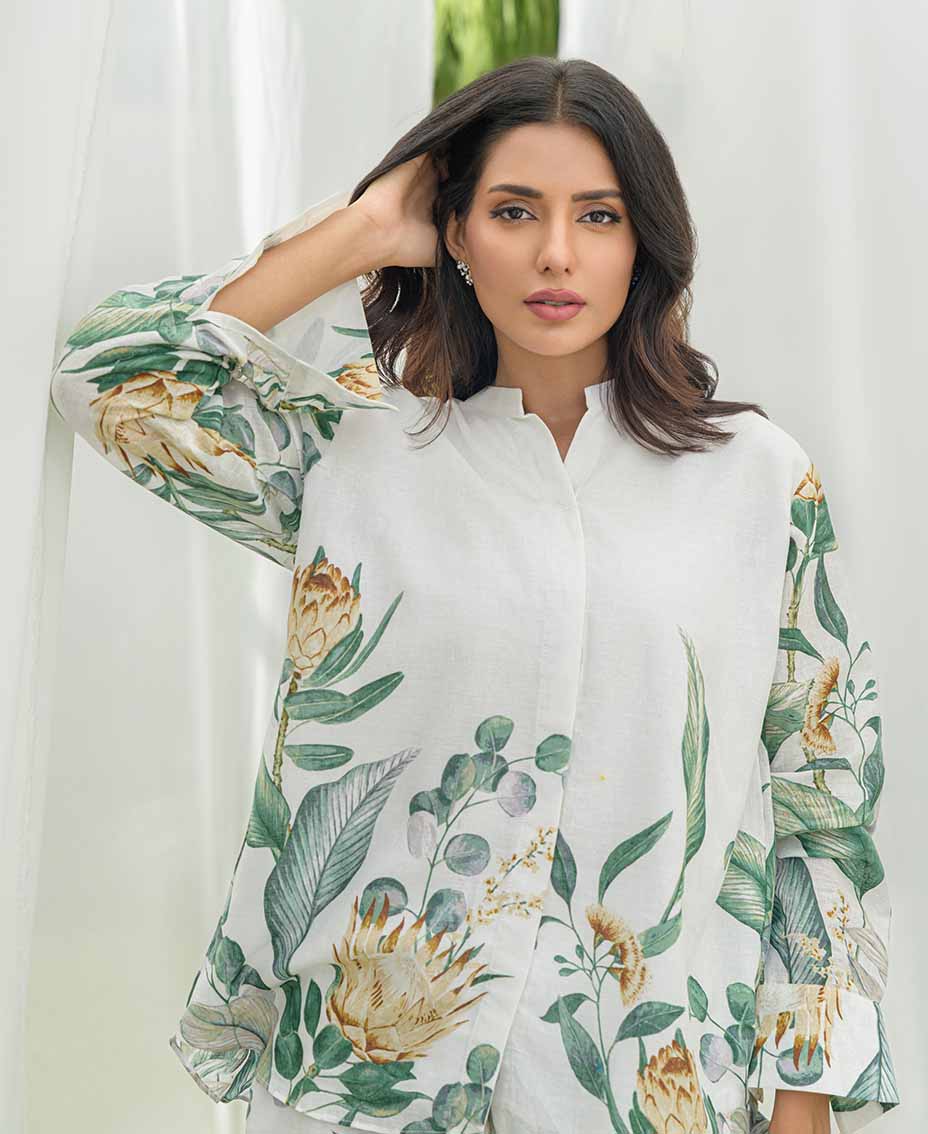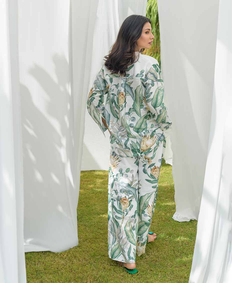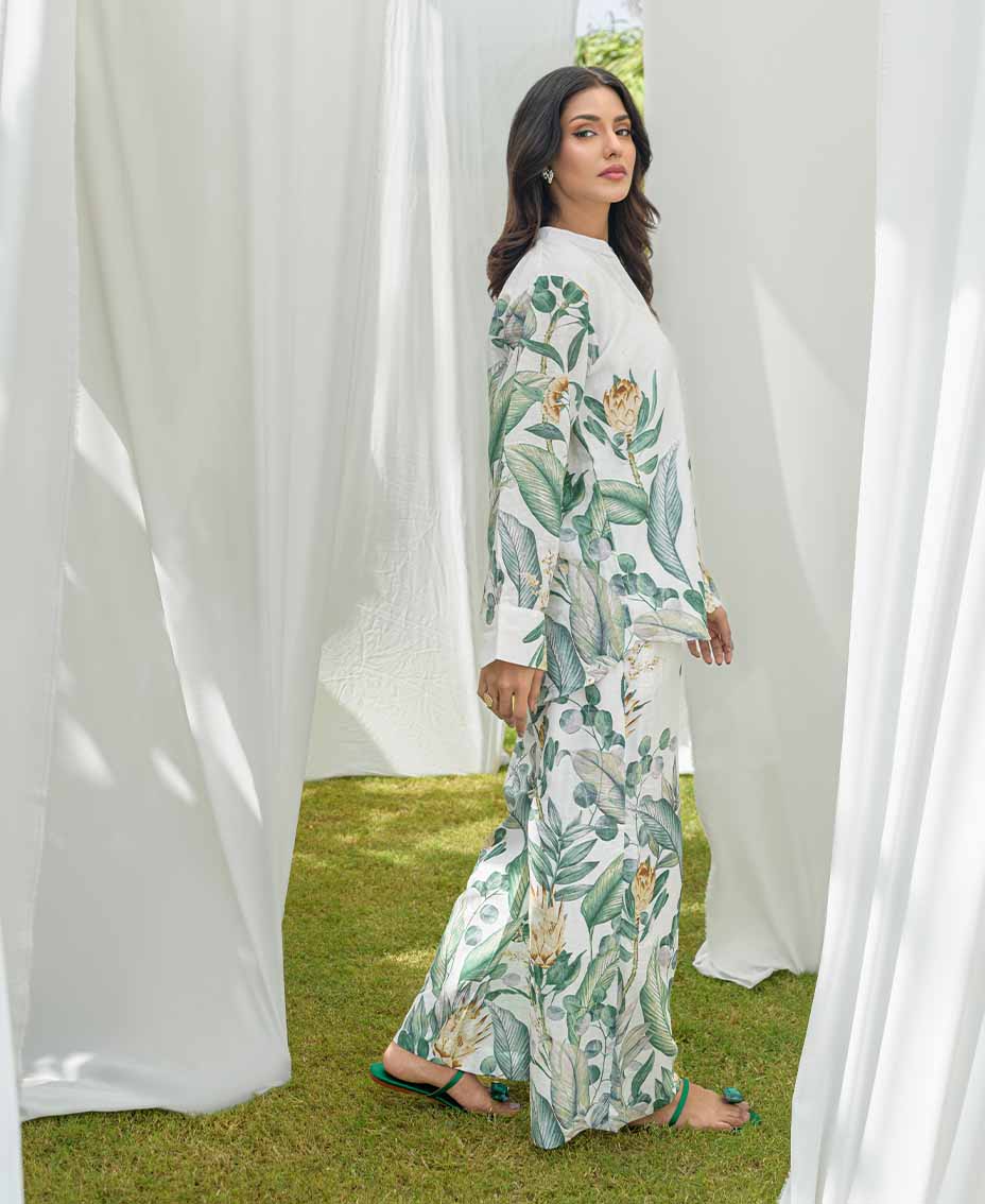 This stylish white co-ord set features a refreshing twist of green accents, on irish fabric, perfect for a relaxed and chic look. The loose-cut top offers a relaxed fit, ensuring comfort and ease of movement. Paired with flared pants, it creates a flattering silhouette that’s both trendy and chic. Crafted from lightweight fabric, it’s ideal for fall days or evenings. Effortlessly stylish, this set is a must-have for your fall wardrobe.