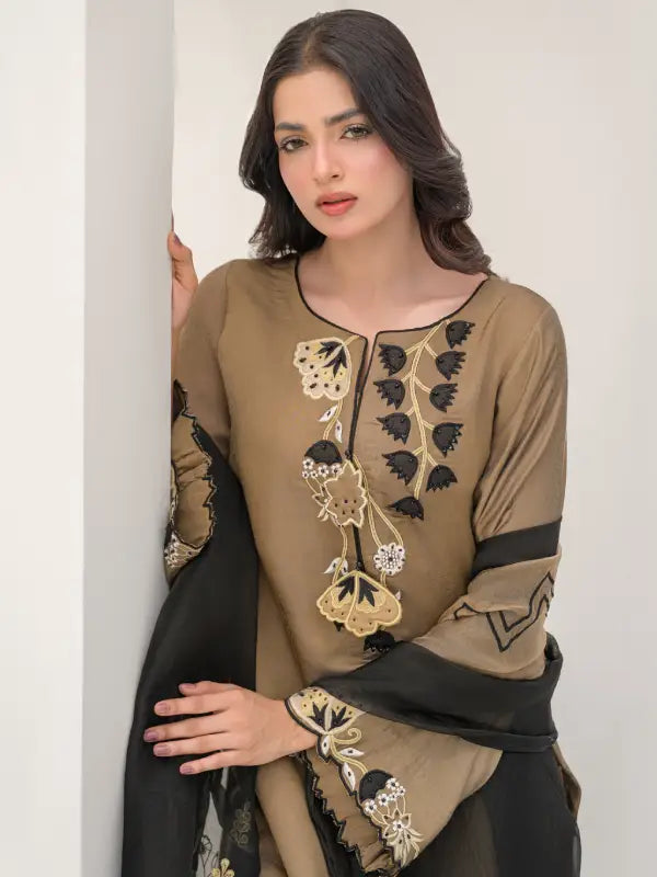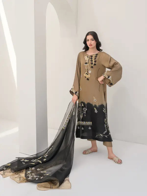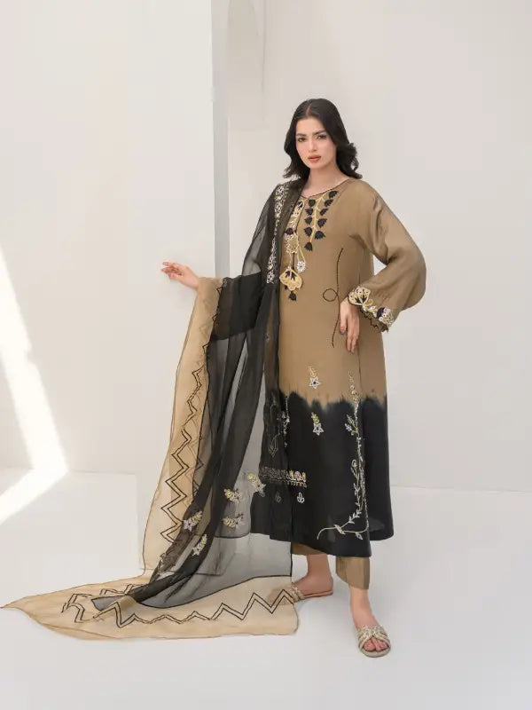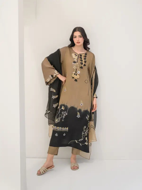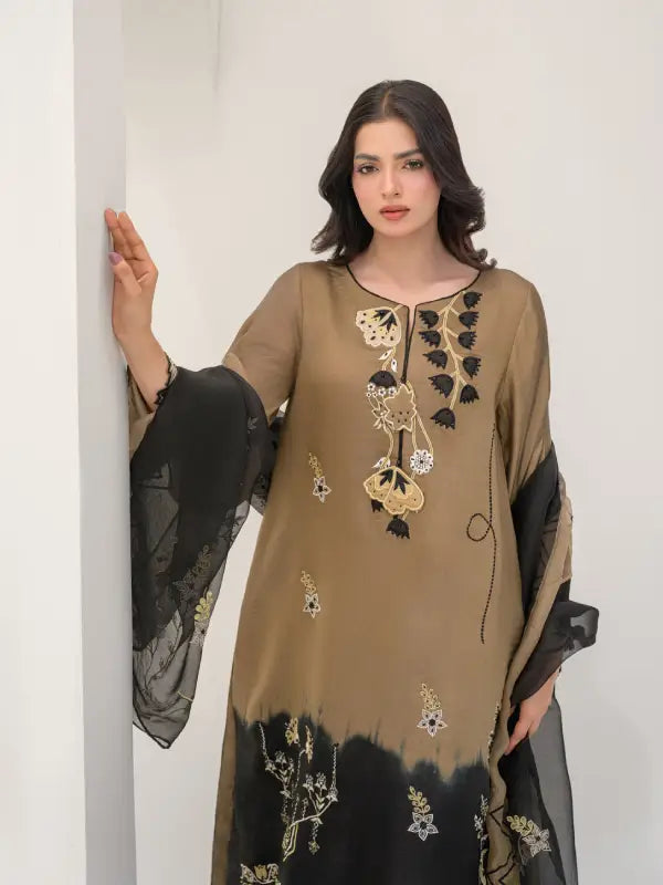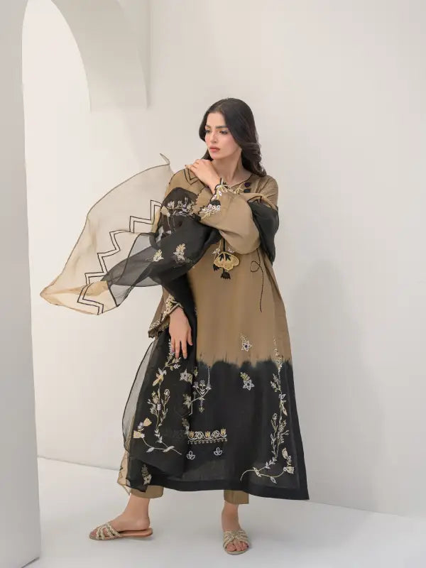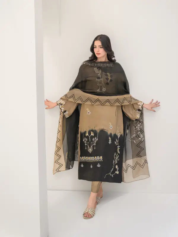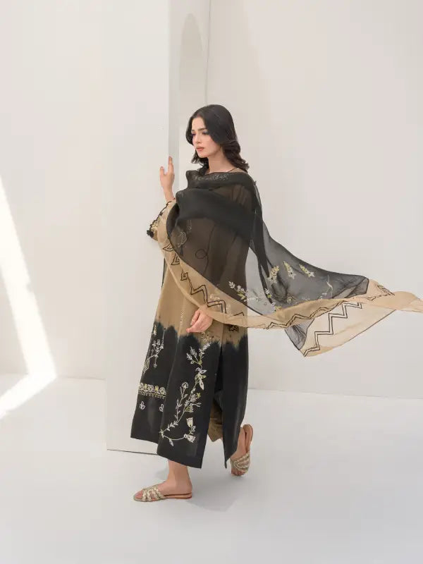 Elevate your style with this stunning double-shaded long shirt, beautifully finished with a bold black dip-dye effect at the hem. The outfit showcases intricate floral and geometric embroidery in classic black and beige tones on the front and sleeves, creating a graceful yet statement look.