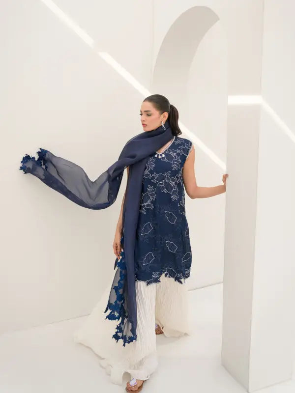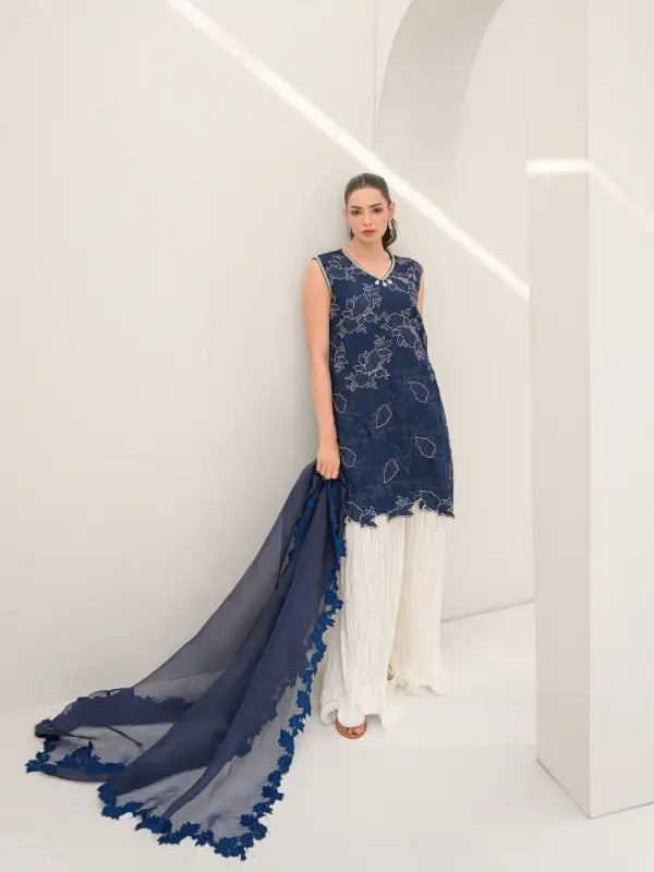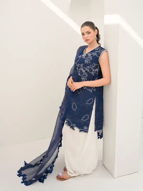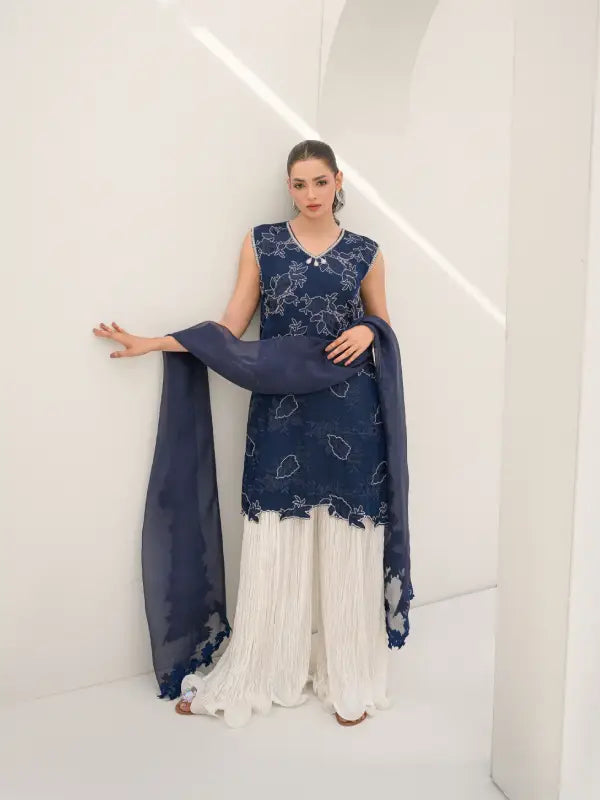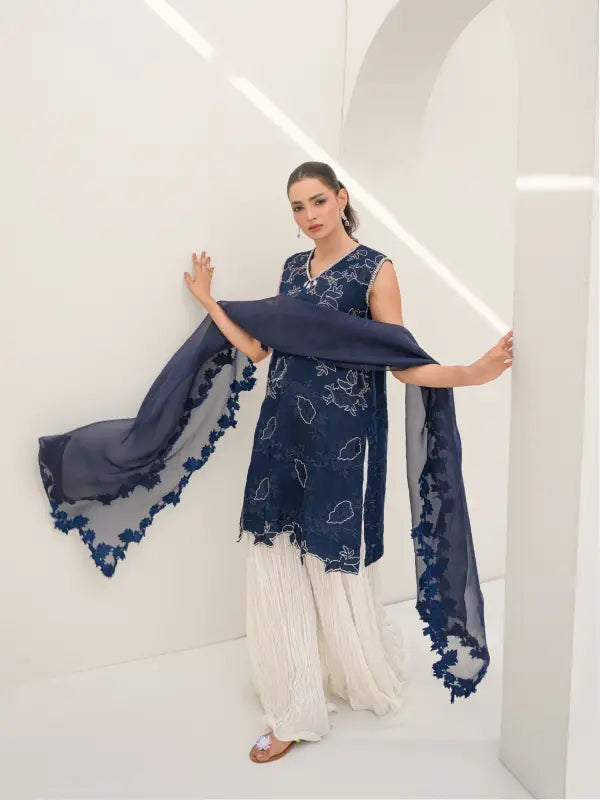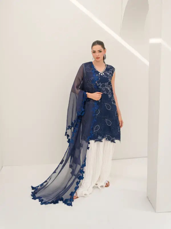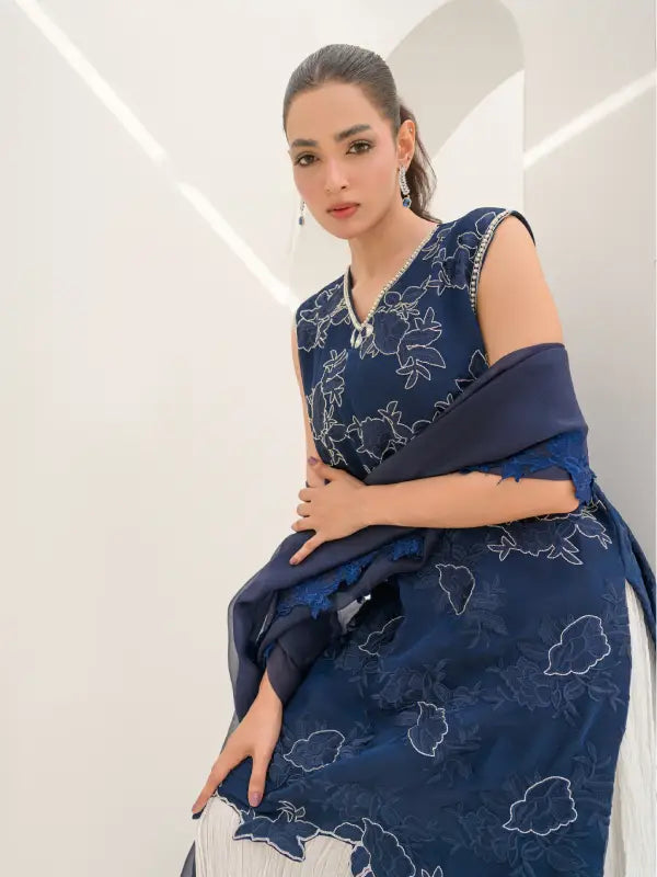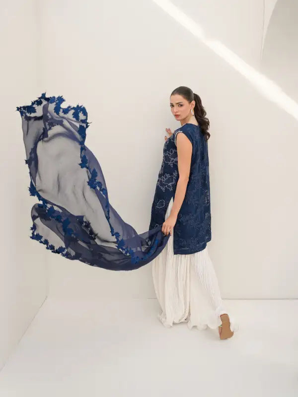 Elevate your occasion wear with this stunning navy blue pure organza sleeveless short shirt, designed with a graceful V-neckline and intricate all-over floral embroidery. The delicate white embellishments and finely detailed cutwork hem create a beautiful lace-inspired appearance, adding charm and sophistication to the outfit. Embroidery along the neckline with elegant tassels enhances its feminine appeal.