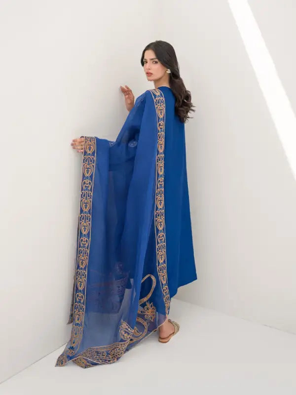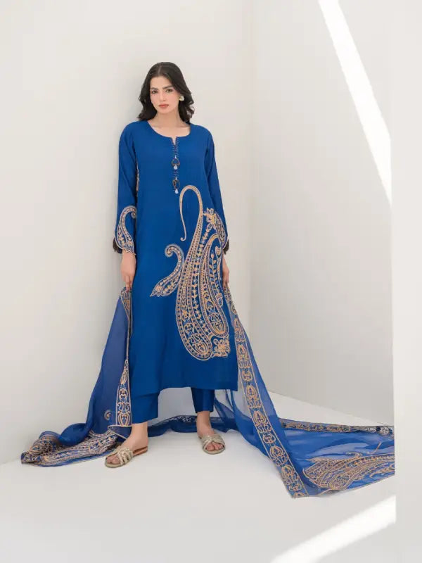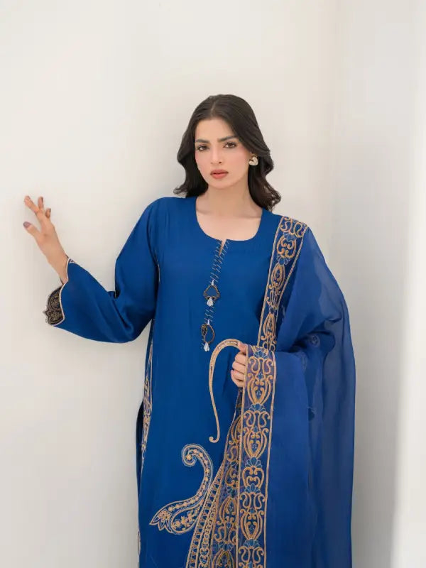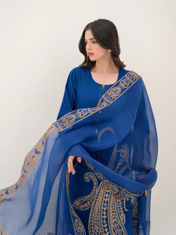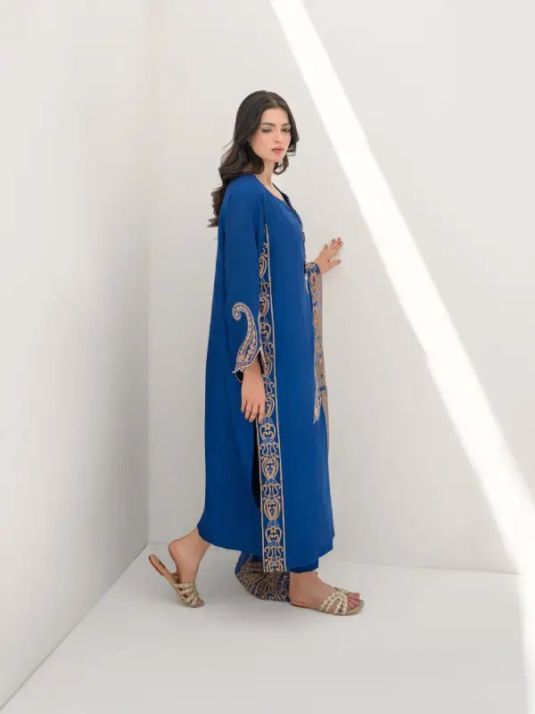 Elevate your festive wardrobe with this elegant blue khaddi silk straight shirt, beautifully adorned with intricate gold embroidered paisley motifs on the front and side hem. Designed with a sophisticated round V-neck featuring delicate detailing and tassels, this outfit blends timeless tradition with modern grace.