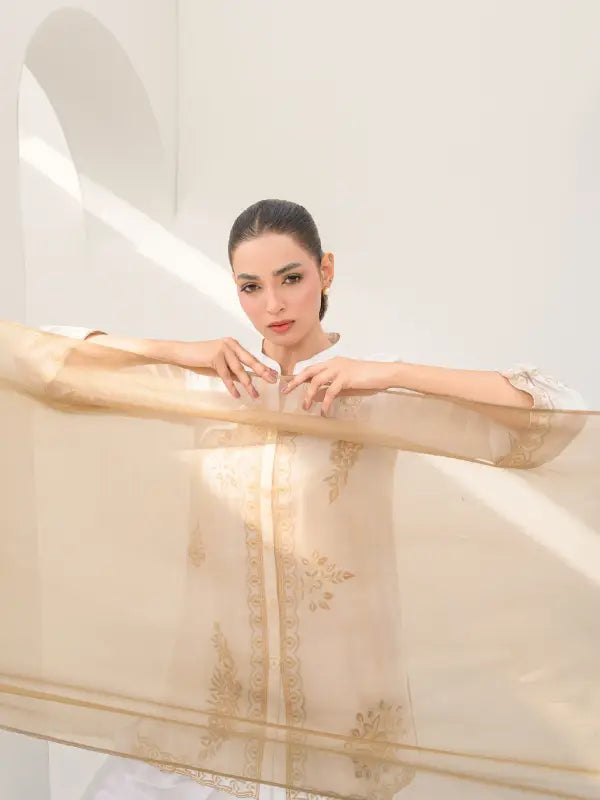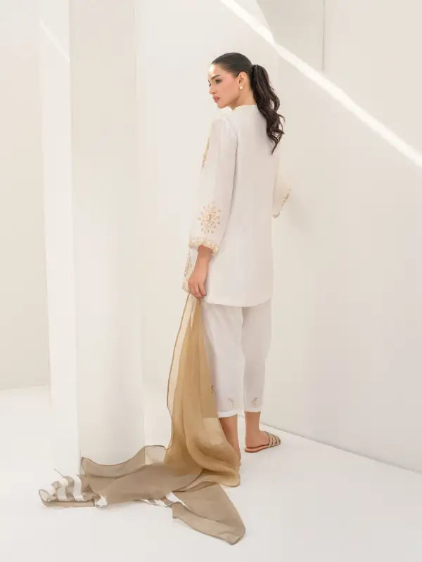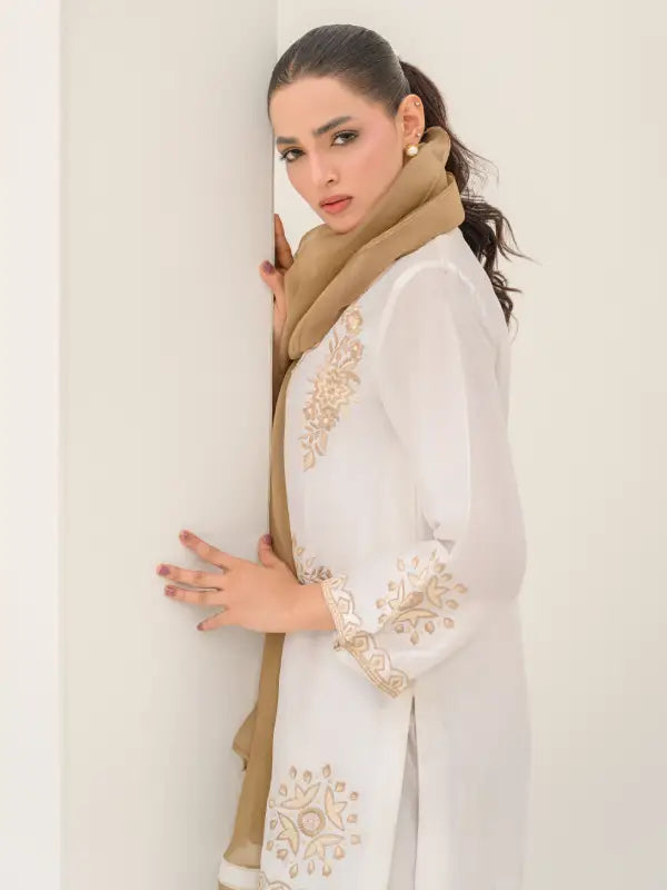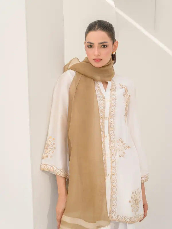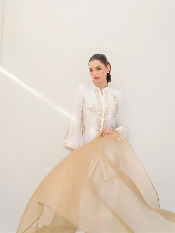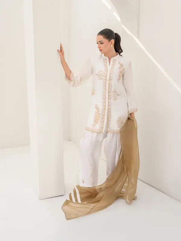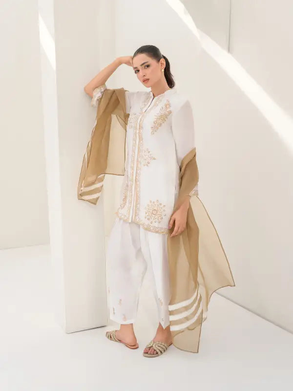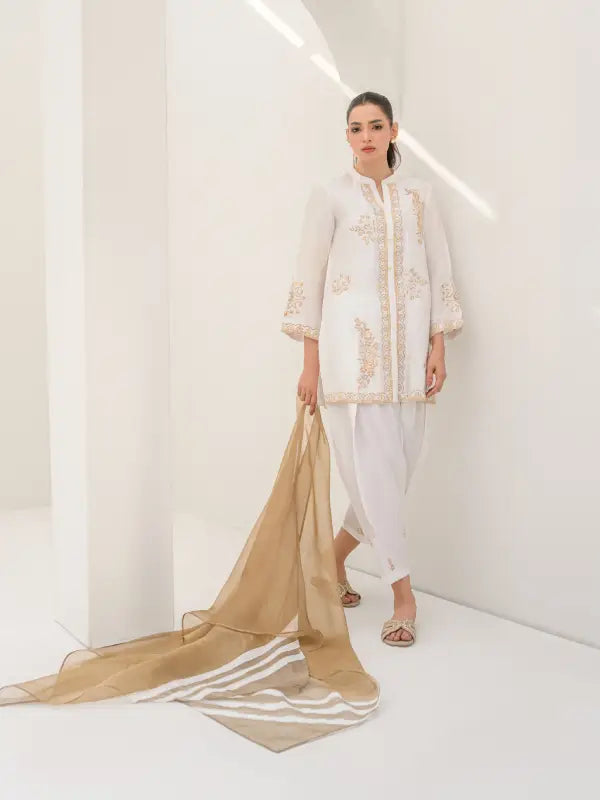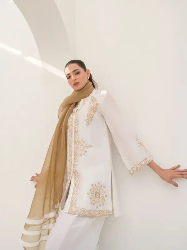 Elevate your festive style with this elegant white sheesha silk short shirt, beautifully adorned with beige embroidered floral and geometric motifs on the front, neckline, and sleeves. The graceful V-neckline with button closure is enhanced with subtle beige detailing along the front placket and hem, adding a refined and sophisticated touch.